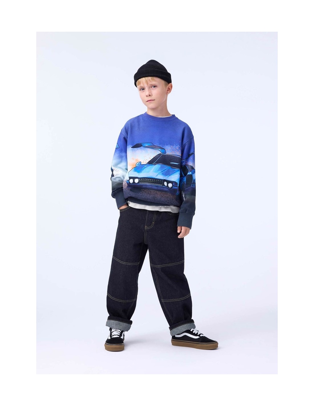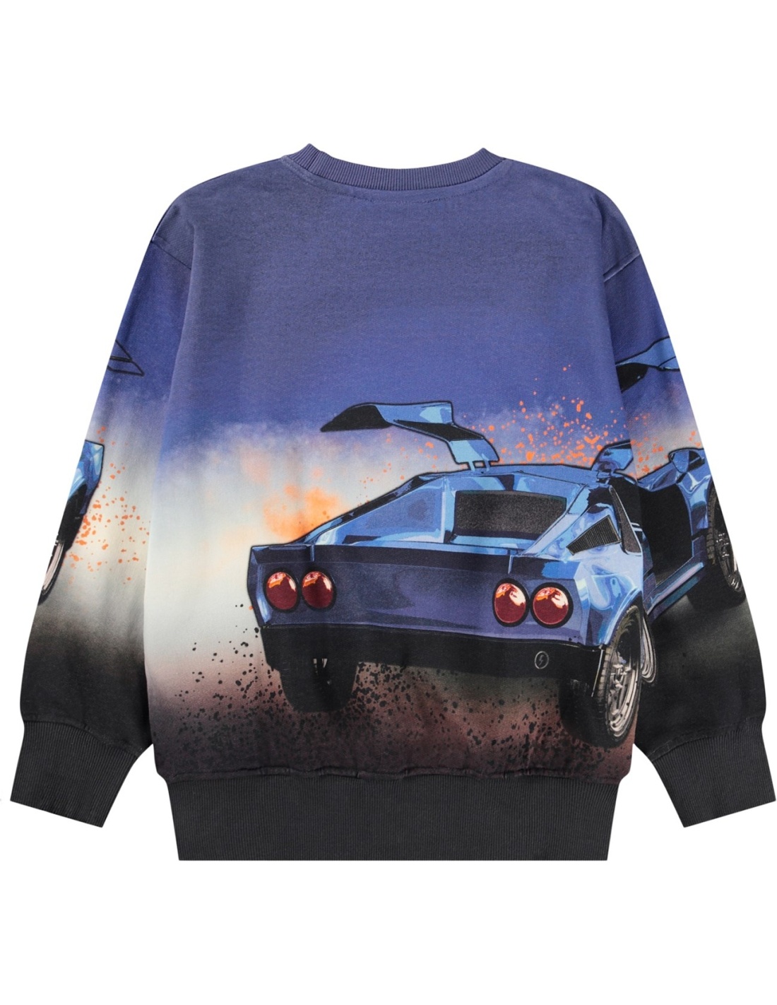 Sudadera azul confeccionada en suave algodón orgánico, con bordes de canalé en el cuello, las mangas y la cintura. Tiene un corte regular y un estampado de un coche de carreras eléctrico.