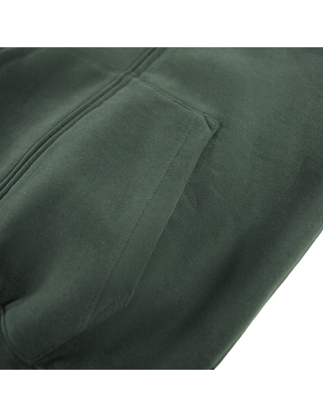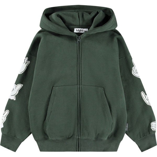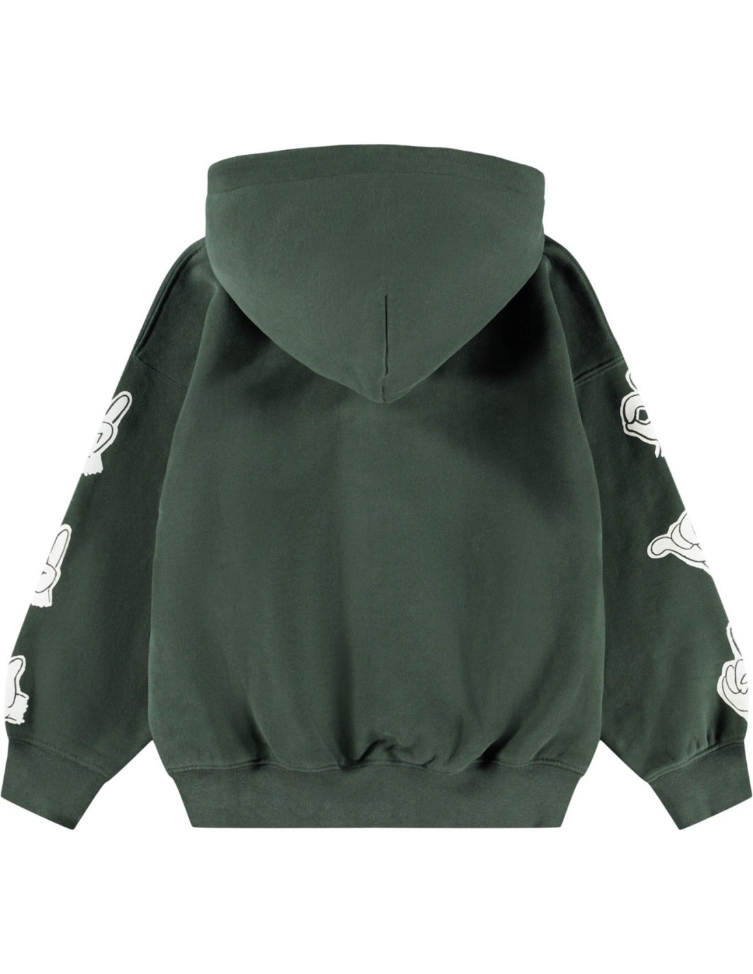 Sudadera con capucha de algodón verde oscuro, con bolsillo canguro, cremallera frontal y acabados de canalé en los puños y el bajo. Esta sudadera tiene estampados blancos de varios gestos de manos en las mangas.