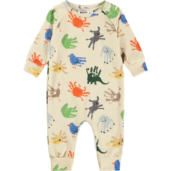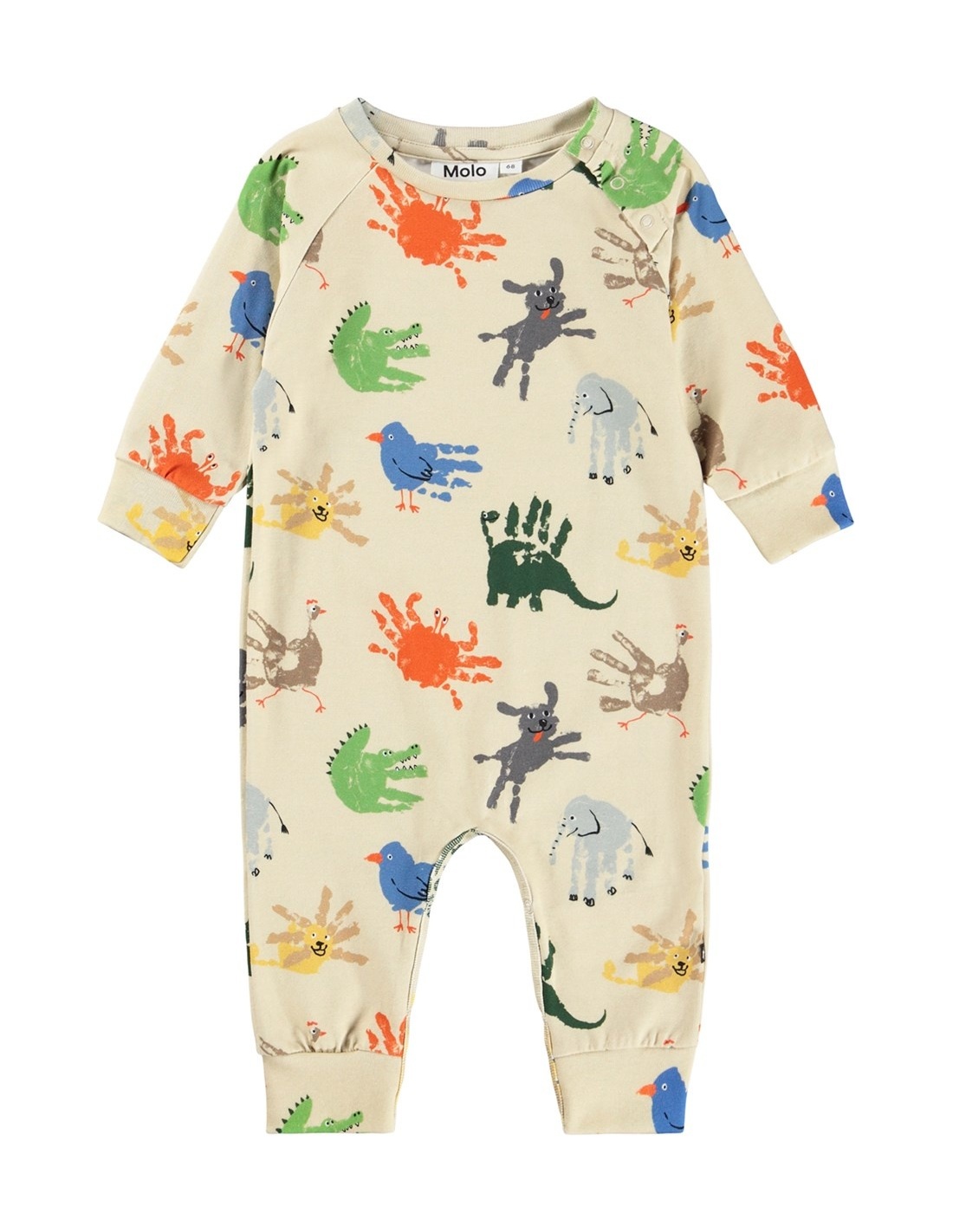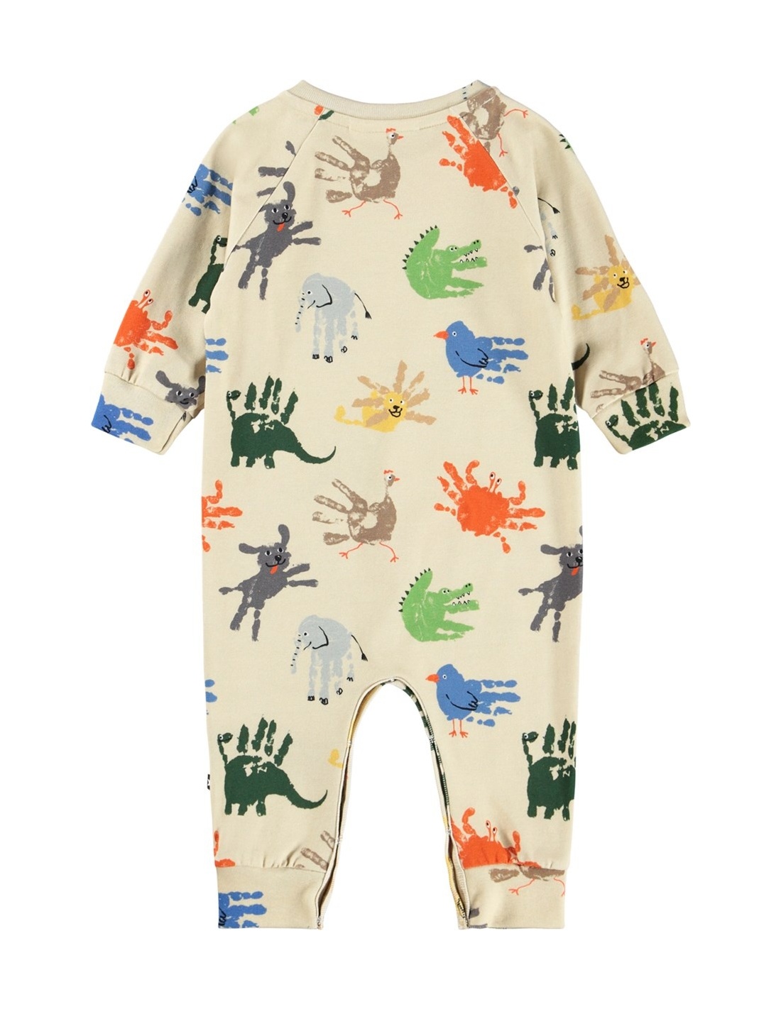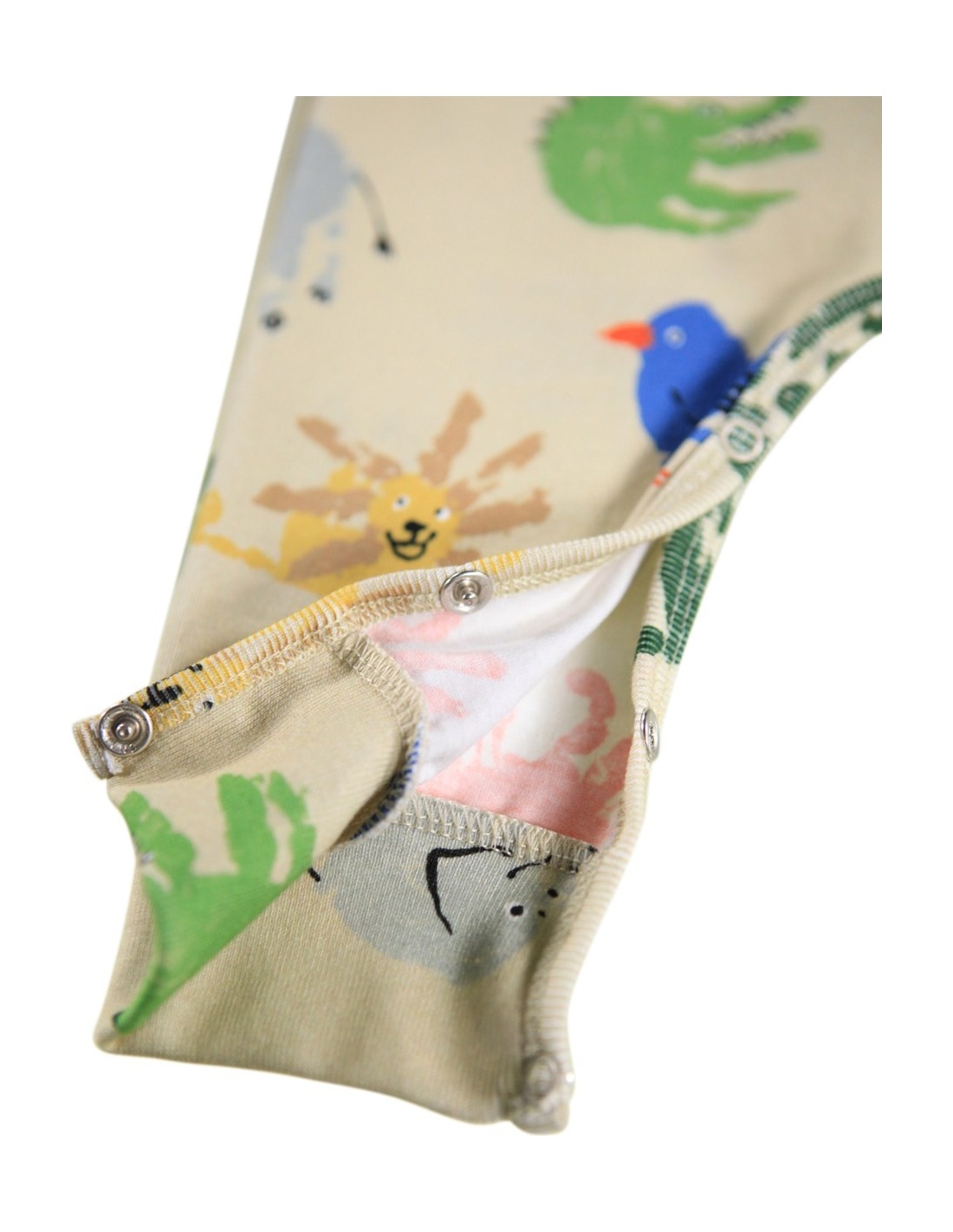 Pelele beige para bebé confeccionado en suave algodón orgánico, con un estampado de huellas de animales. Tiene mangas y perneras largas, así como botones a presión en un hombro y entre las piernas para facilitar el poner y quitar. Su diseño es holgado y cuenta con bordes de canalé en las mangas y los bajos, lo que lo hace cómodo de llevar y ofrece libertad de movimiento.