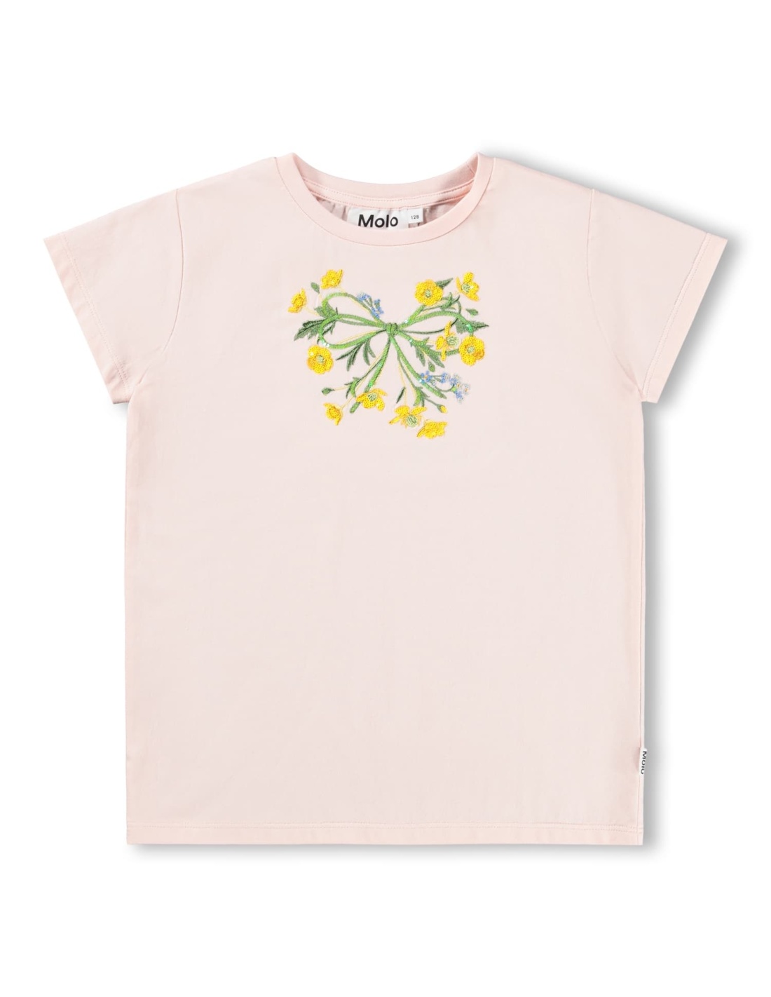 Camiseta de manga corta en delicado tono rosa claro, confeccionada en suave algodón orgánico. Cuenta con un corte clásico y cómodo, y su parte frontal destaca por un bordado de flores con lentejuelas que aporta un toque brillante y encantador, perfecta para darle estilo a cualquier conjunto.