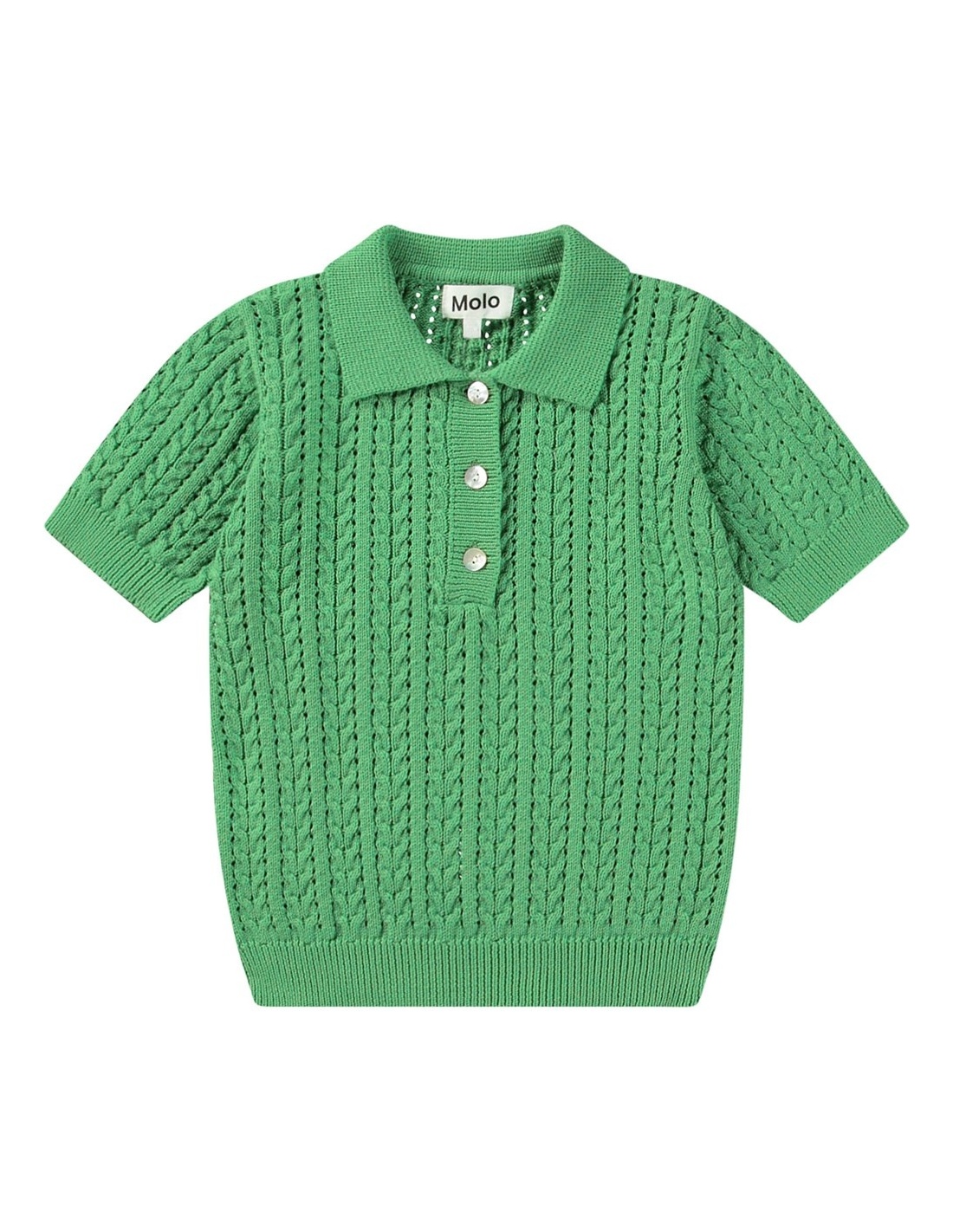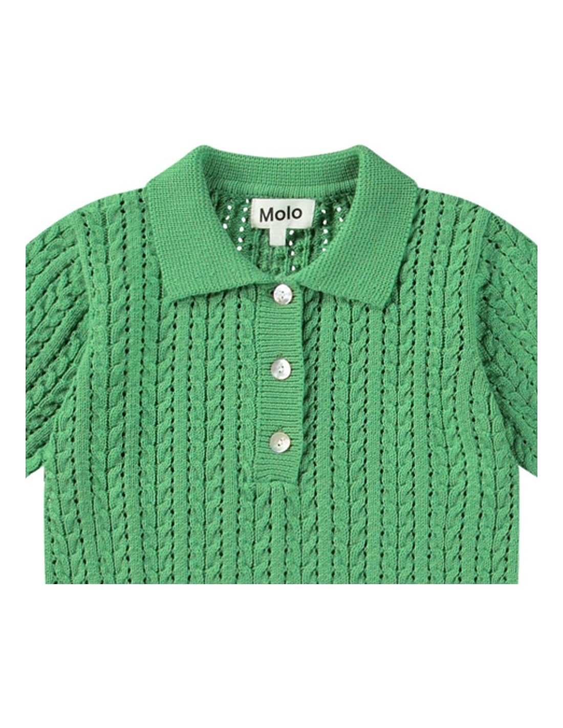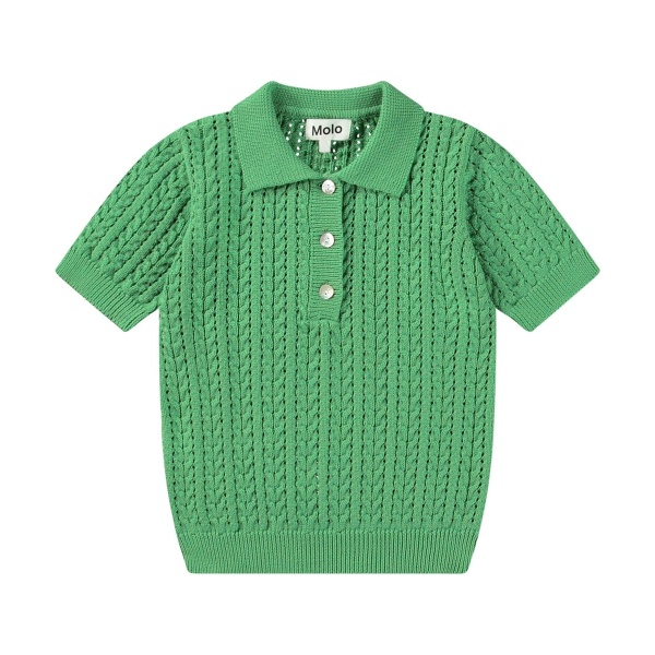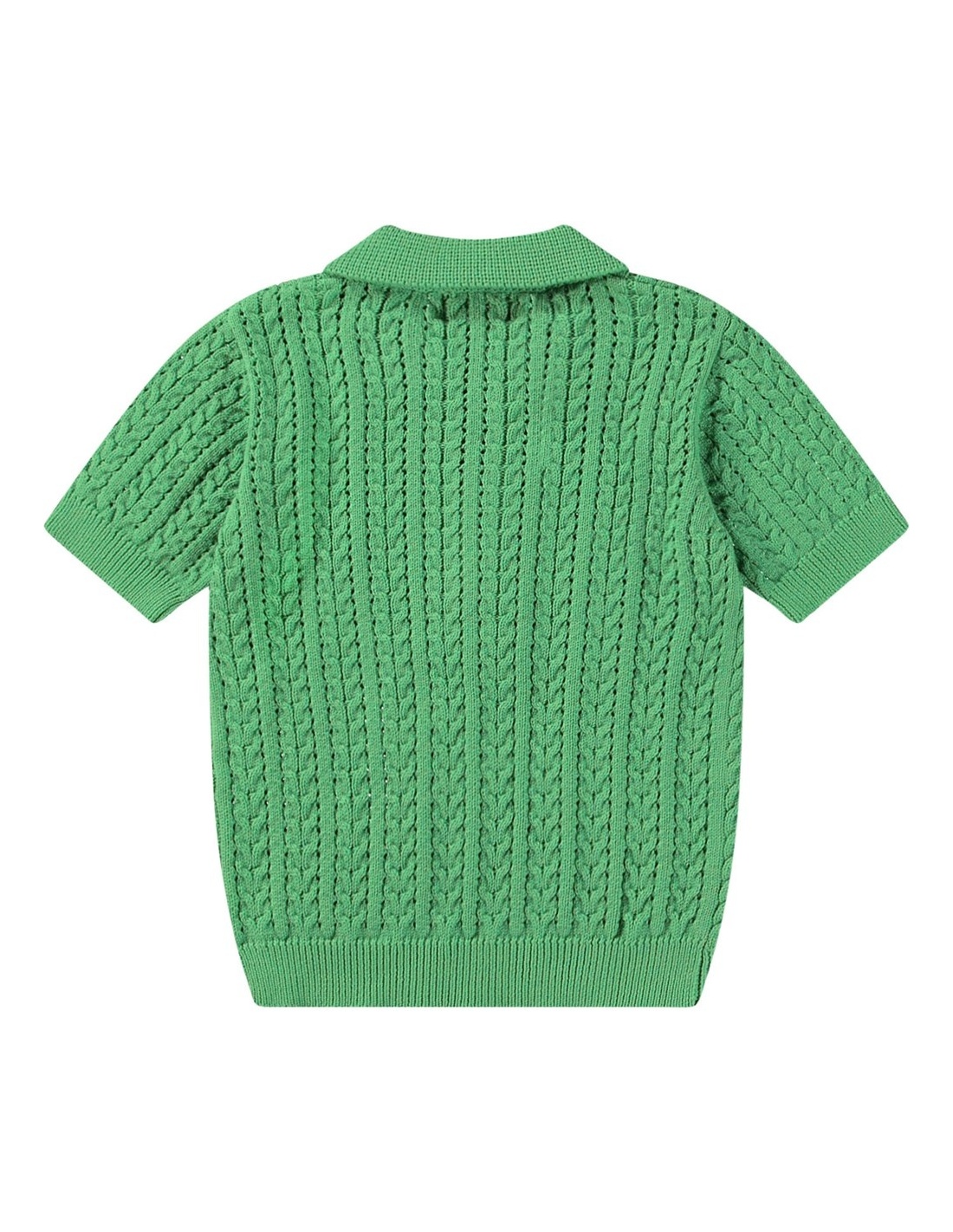 Camiseta verde de punto en suave algodón orgánico. La camiseta tiene un cuello clásico, bordes acanalados en las mangas, en la parte inferior de la camiseta y tres botones de nácar. La camiseta está tejida con un bonito patrón de encaje, lo que le da un aspecto exclusivo.