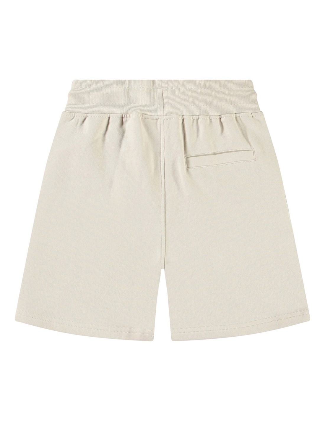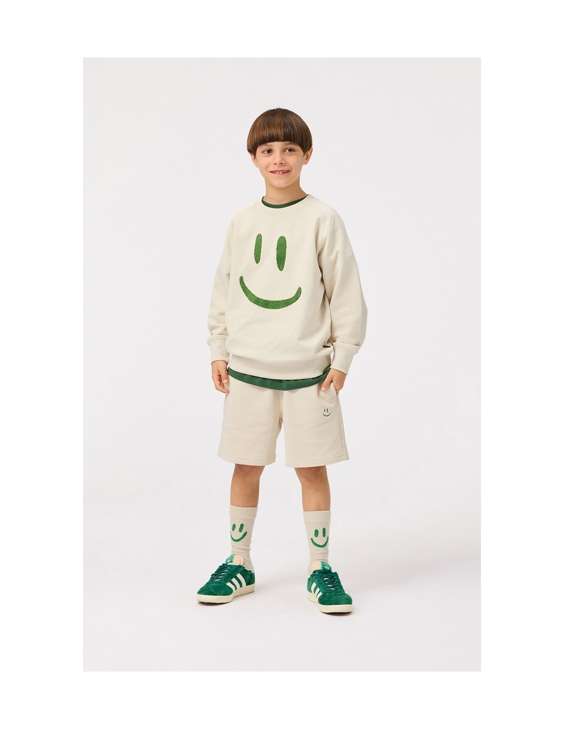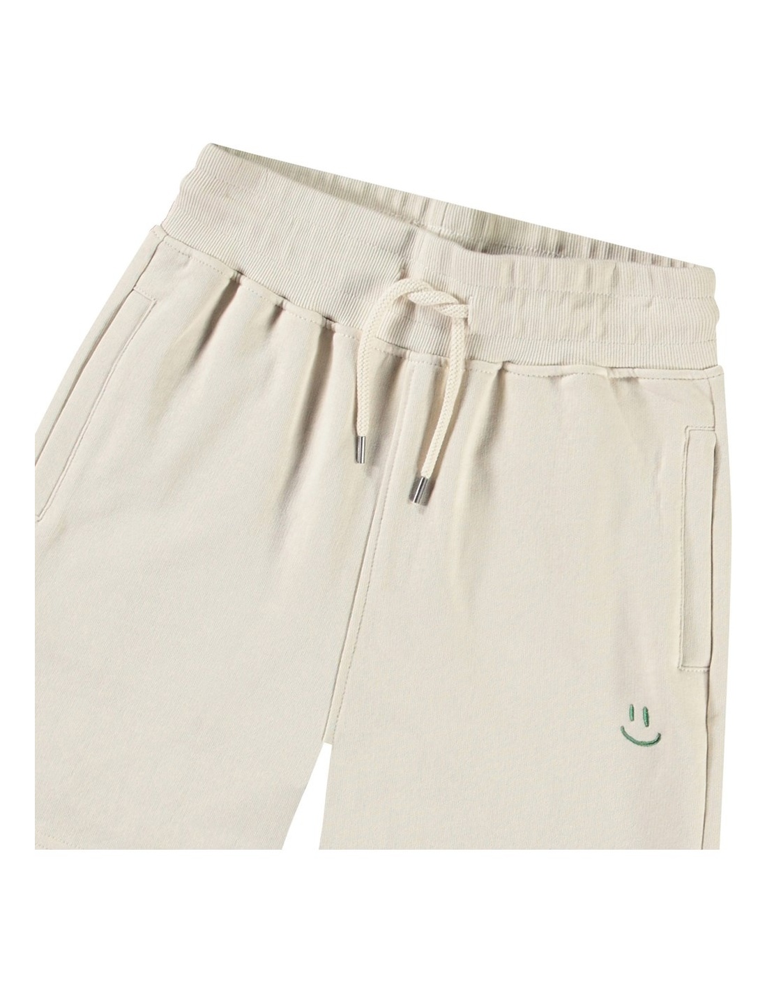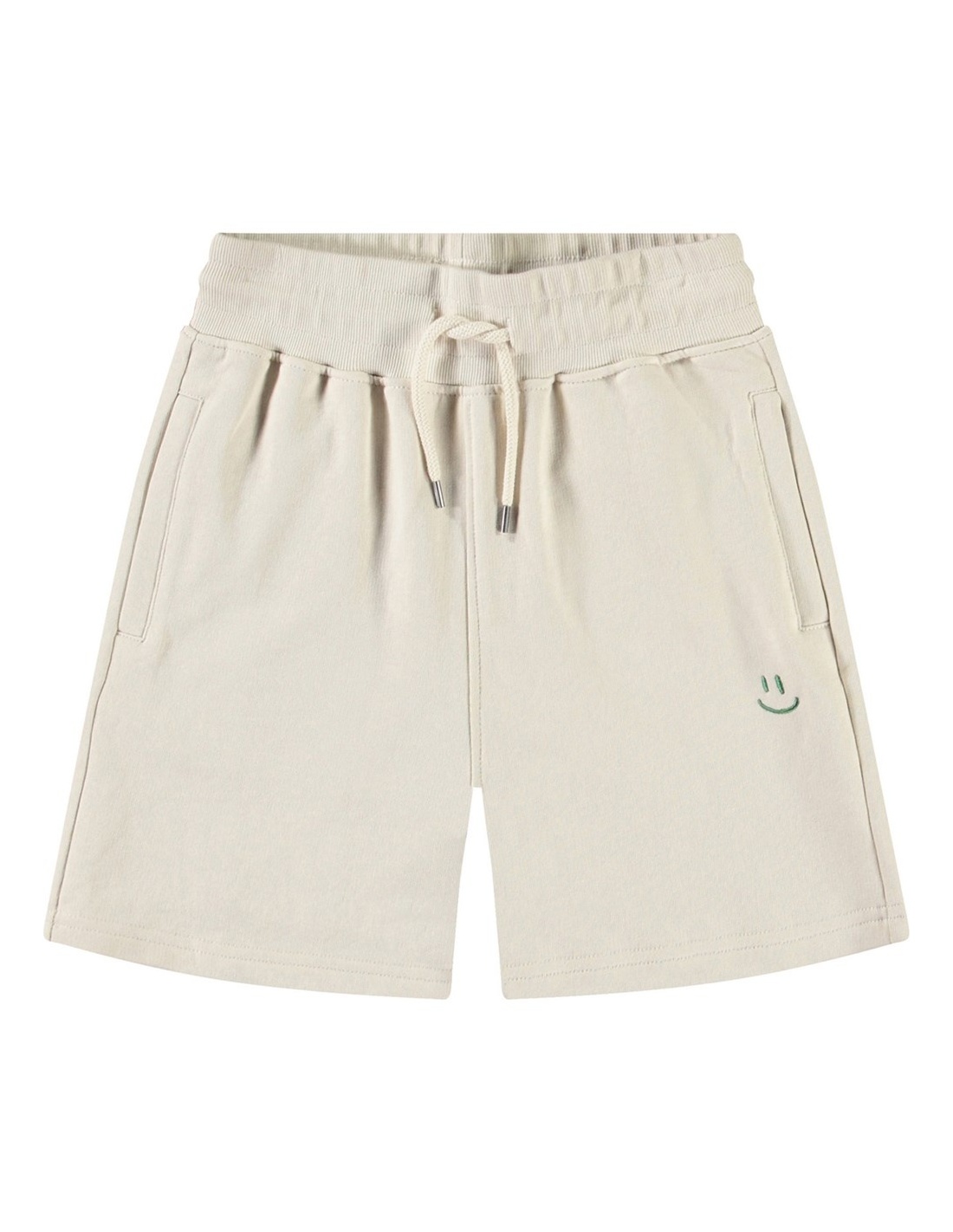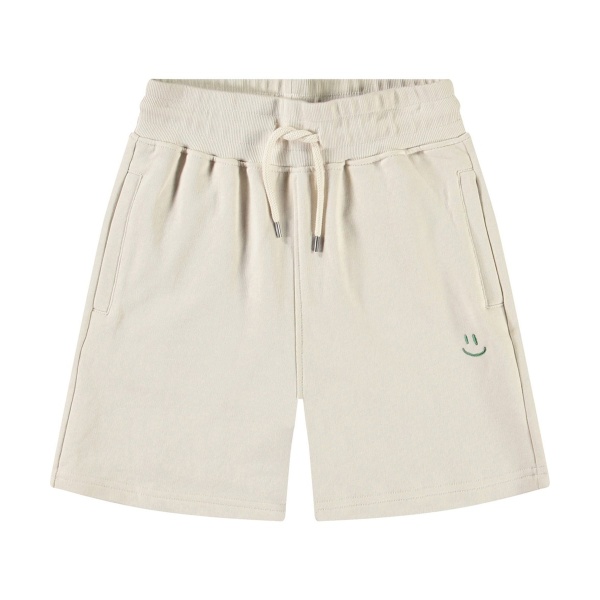 Pantalones cortos beige de corte amplio en suave algodón orgánico. Los pantalones tienen un ajuste suelto con una cintura elástica ancha y cordón, lo que los hace fáciles de ajustar y cómodos de llevar. Cuentan con bolsillos en la costura lateral y un único bolsillo trasero. En el frente, tienen un pequeño bordado de una carita sonriente verde.