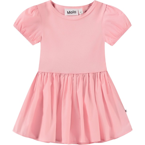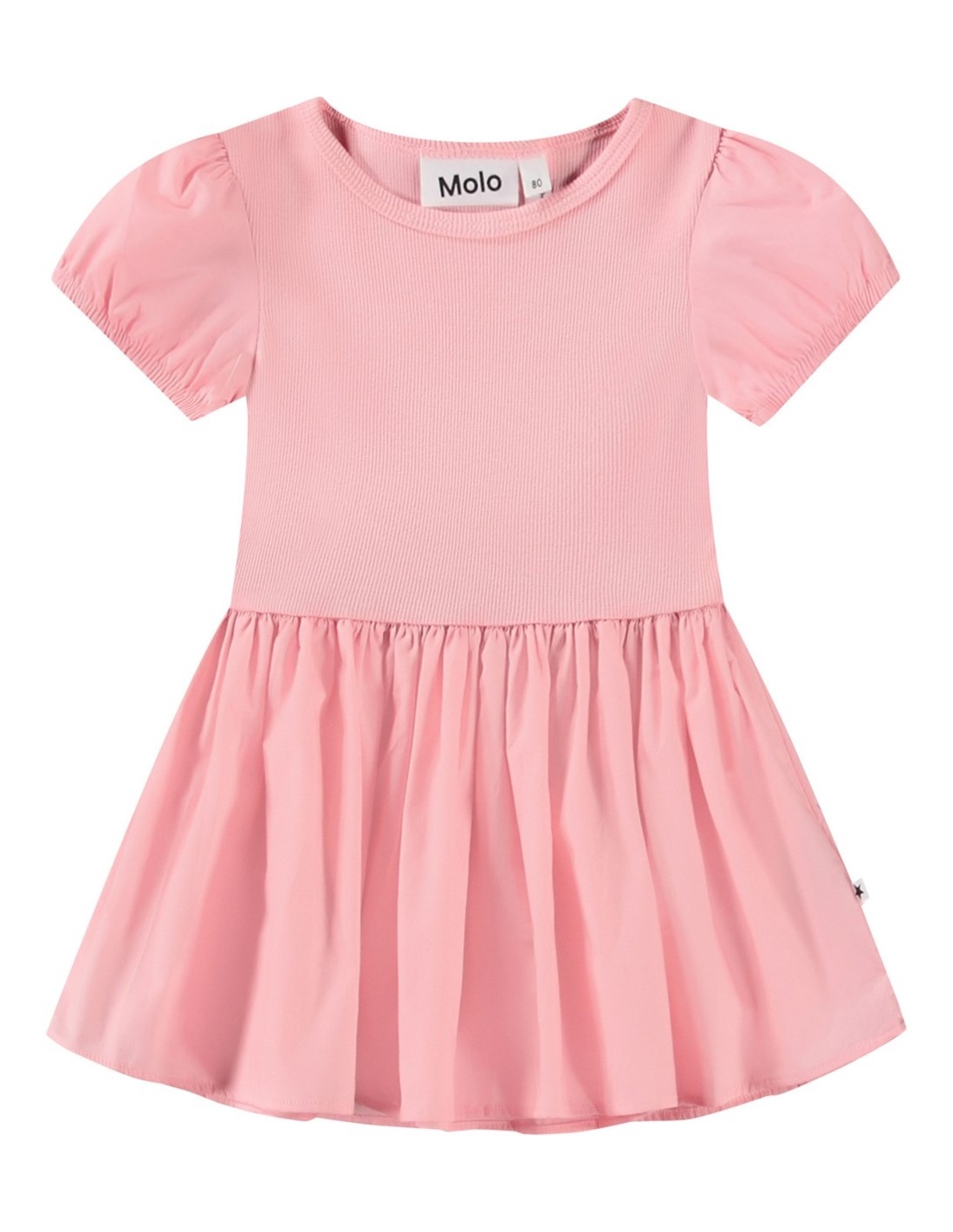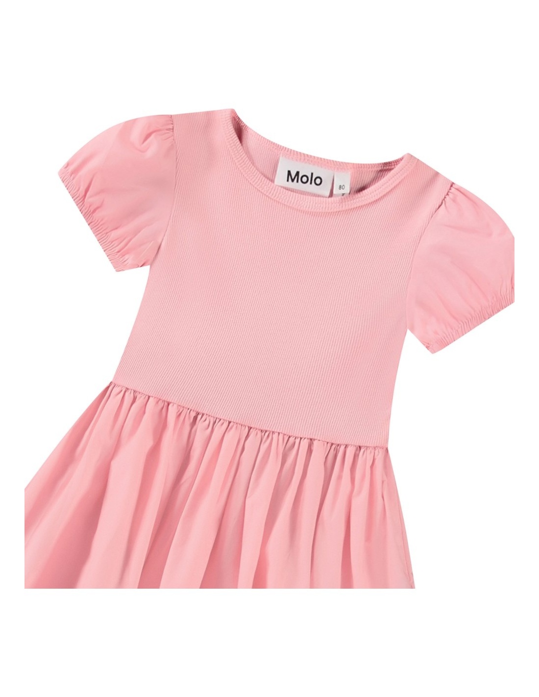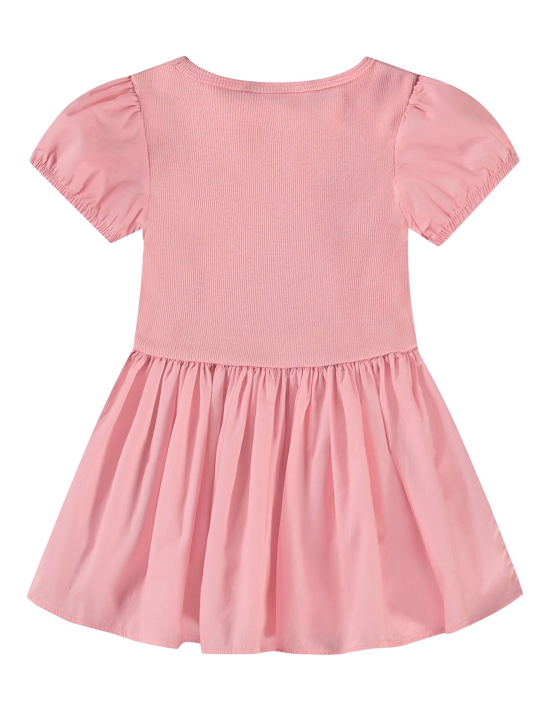 Vestido rosa de algodón orgánico. La parte superior del vestido tiene elasticidad para permitir un buen movimiento. Cuenta con un cuello redondo, mangas cortas abullonadas con elástico y una falda circular. Las mangas y la falda están hechas de popelín.