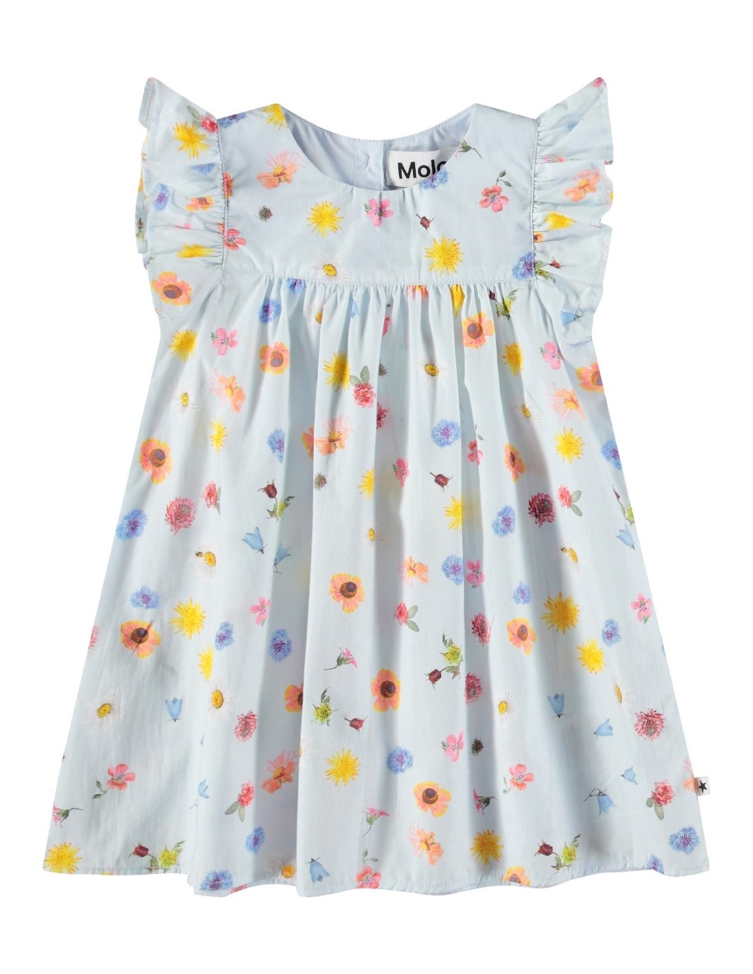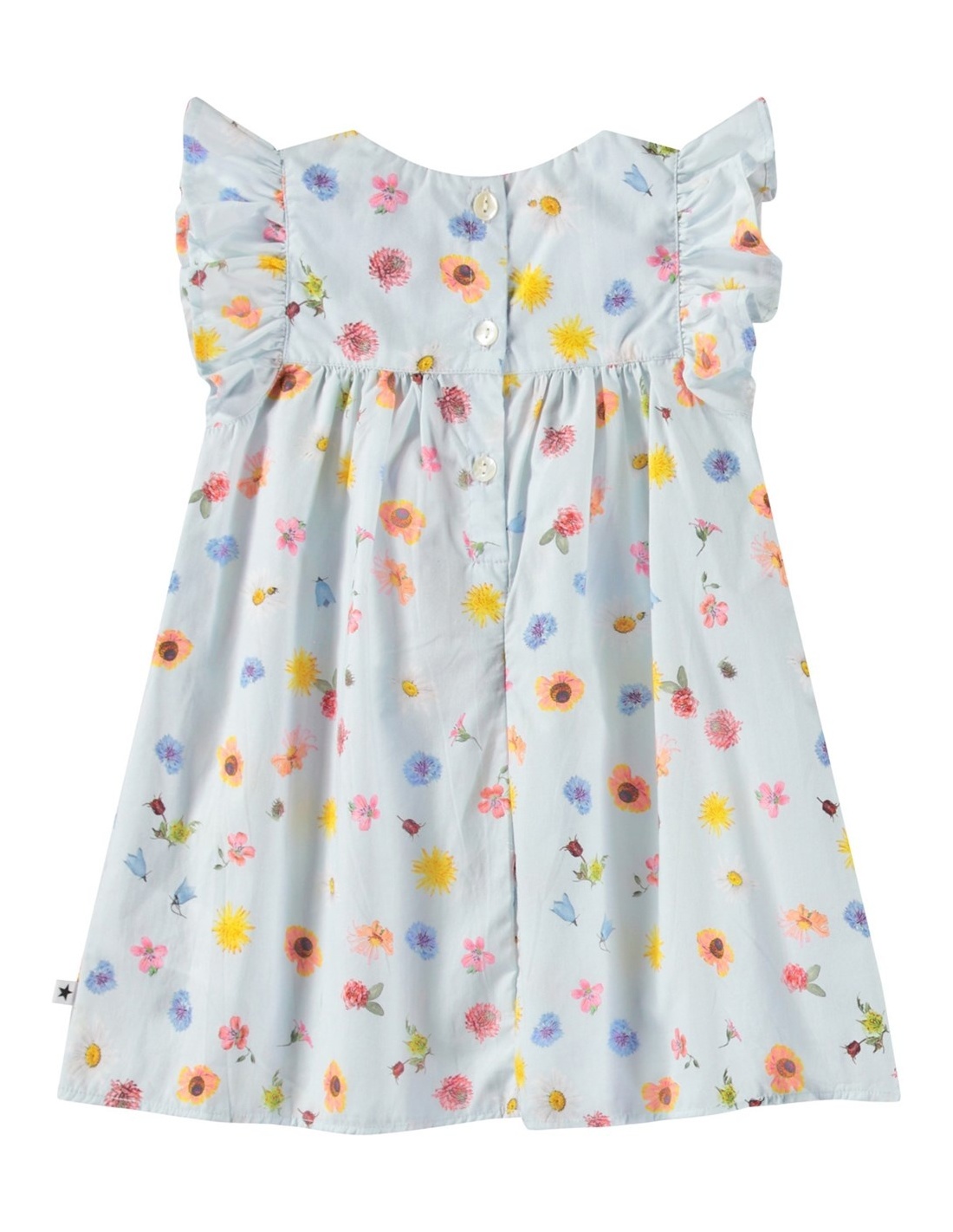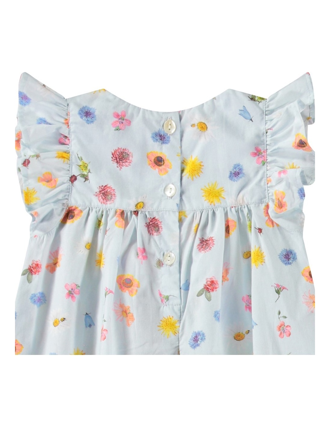 Vestido en popelín de algodón orgánico. Tiene pequeñas mangas con volantes, una cintura alta y cierre de botones en la parte trasera. Es de color azul claro con un estampado floral.