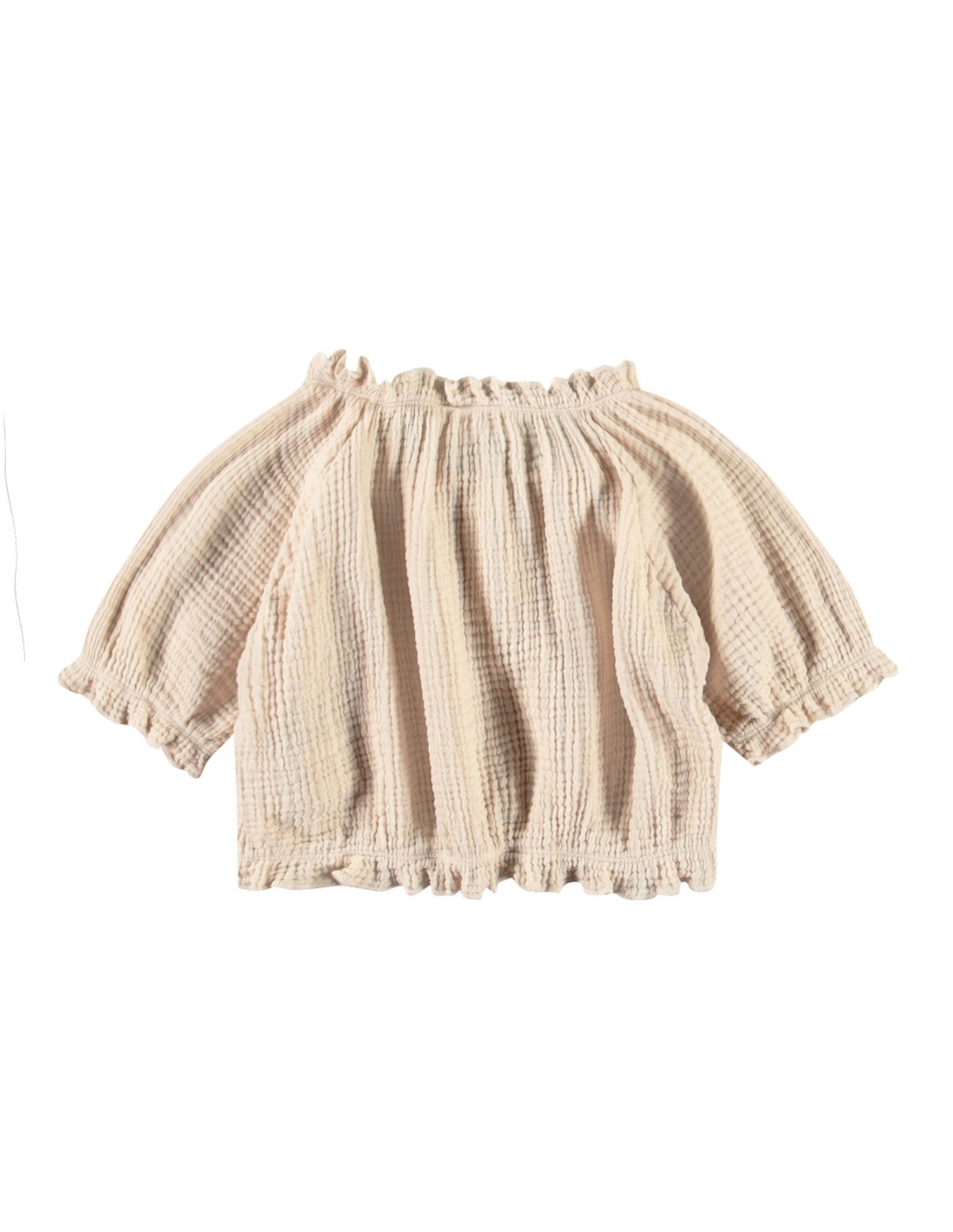 Top beige en algodón orgánico arrugado para los más pequeños. Tiene mangas cortas y bordes con volantes en las mangas y el escote.