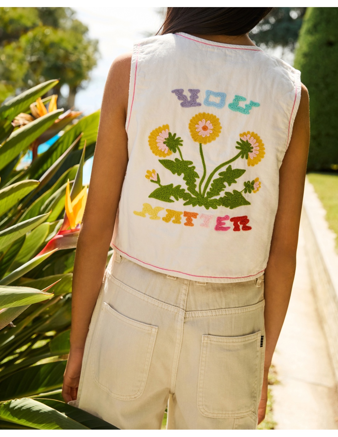 Chaleco ligero ideal como complemento para los looks más divertidos y vibrantes. 100% de algodón orgánico y con bordado floral dará un upgrade a cualquier look.