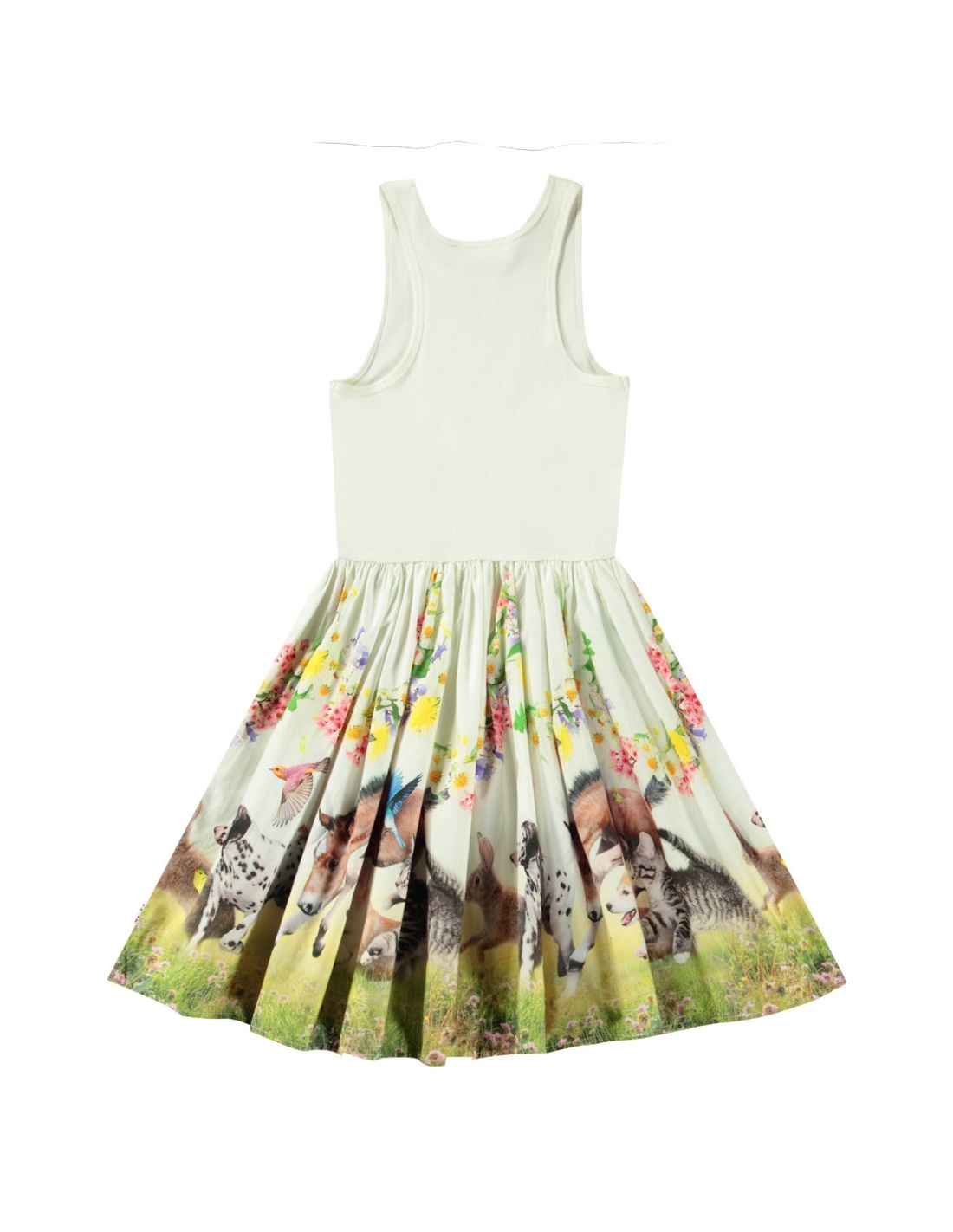 Vestido corto de manga corta en color blanco roto, de algodón orgánico, con la parte superior de punto acanalado ajustado y falda de popelín. El vestido tiene un corte regular y un estampado colorido en la falda con hermosos animales.