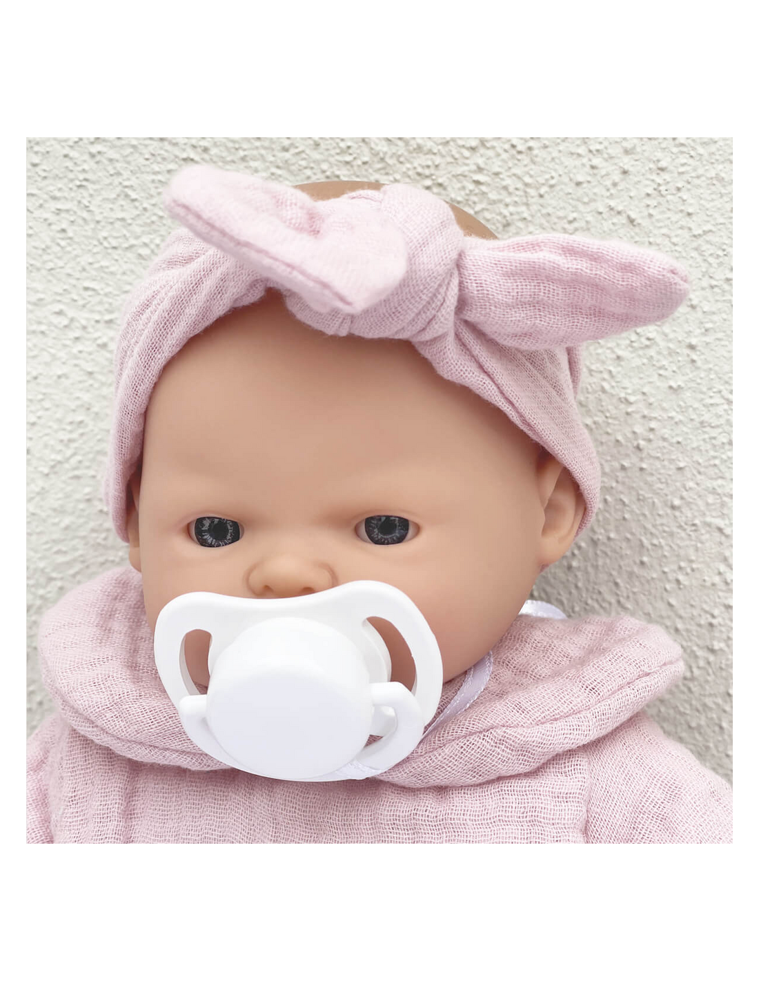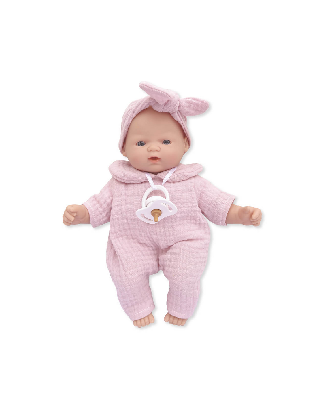 La muñeca Nina BOBBLE rosa de 26 cm es una muñeca suave y flexible, hecha de algodón orgánico. Viene con un mono y diadema de gasa de algodón orgánico, perfecta para llevar a todas partes.