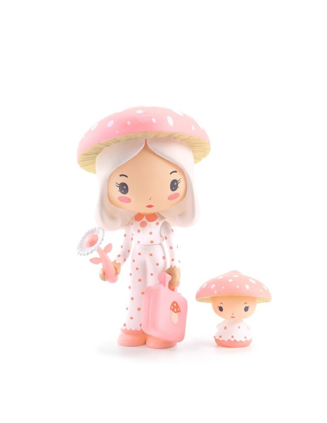 Una madre y su hija, ambas llevando gorros en forma de seta que les dan un aire mágico y encantador. La madre, además, lleva un maletín rosa, ideal para sus pequeñas aventuras. Con detalles delicados y articulaciones en los brazos y la cabeza, estos personajes son perfectos para coleccionar, jugar y dar vida a historias fascinantes. ¡Una adición irresistible para cualquier colección Tinyly!
