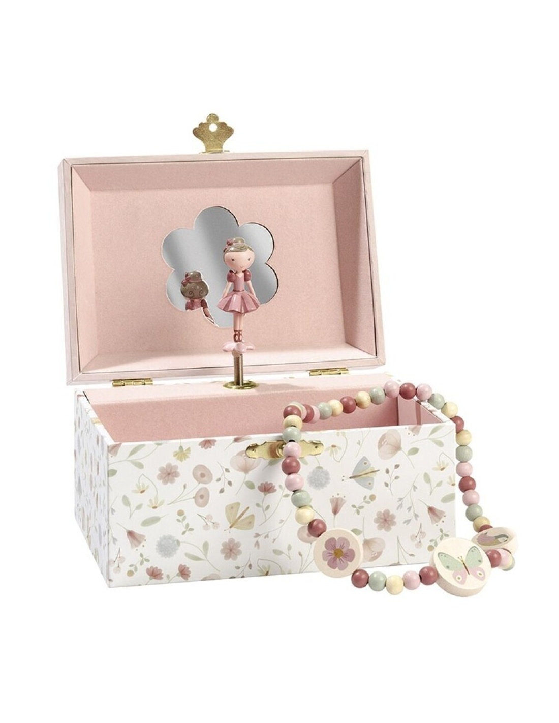 La caja musical joyero Little Dutch presenta un diseño de Flores y Mariposas, y en su interior cuenta con un espejito en forma de flor.