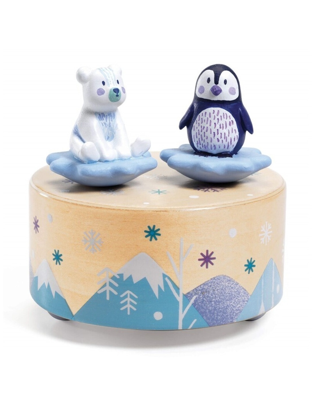 Es una caja de música redonda, magnética y bellamente ilustrada, que cuenta con dos adorables figuritas: un oso y un pingüino. Al darle cuerda, las figuritas comienzan a girar y bailar al ritmo de la melodía de la "Sinfonía de los juguetes" de Wolfgang Amadeus Mozart, creando un espectáculo encantador que deleitará a los más pequeños.