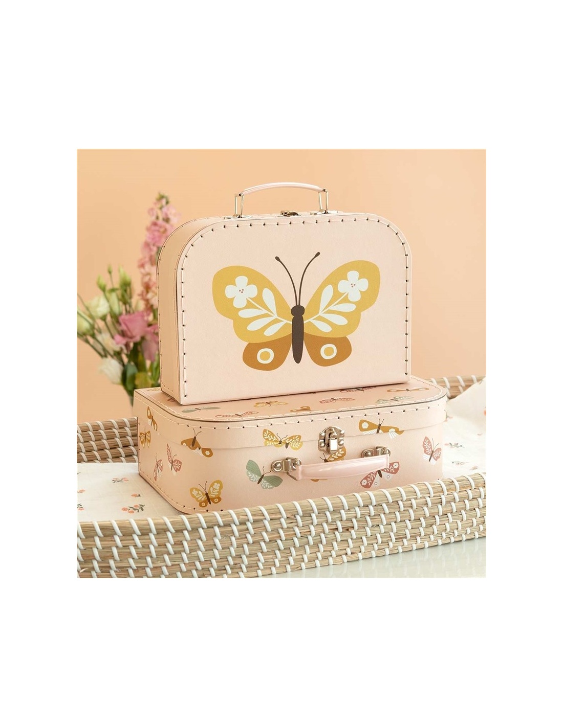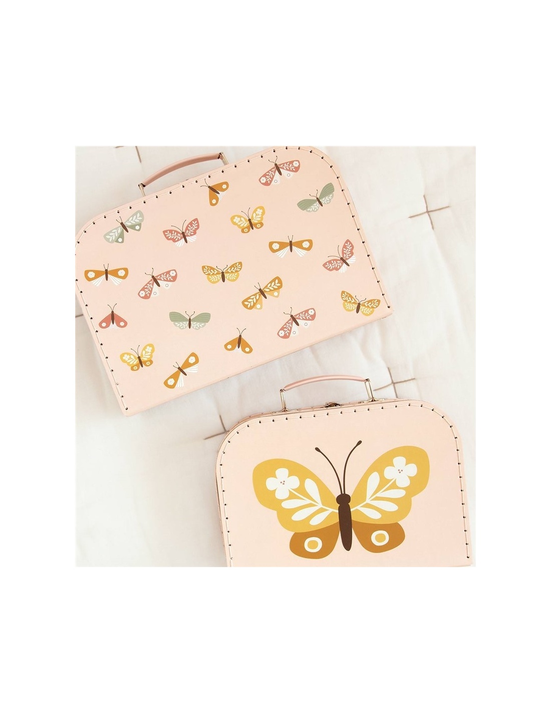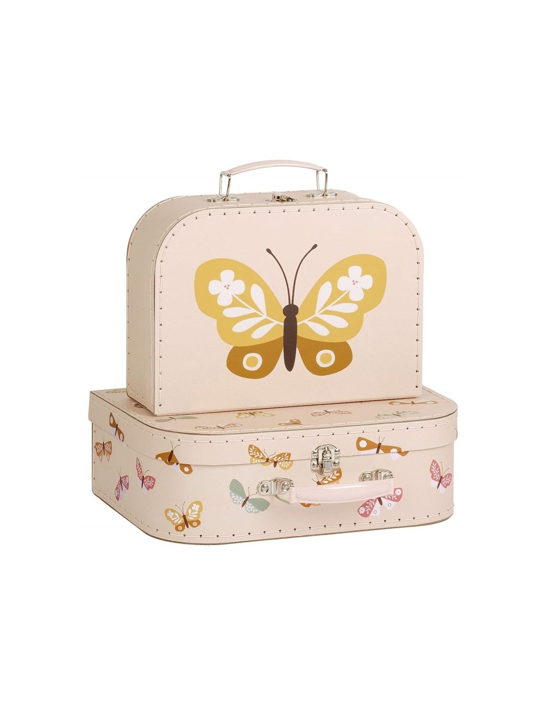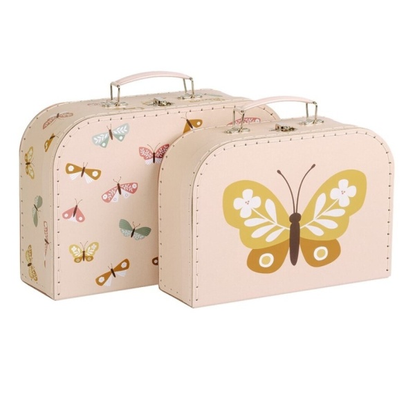El juego de maletas de cartón está diseñado para guardar artículos como pañales o como decoración para la habitación infantil. El juego consta de dos tamaños diferentes de maletas, hechas de cartón resistente con costuras de poliéster. Ambas maletas cuentan con un asa metálica y una hebilla para cerrarlas.
