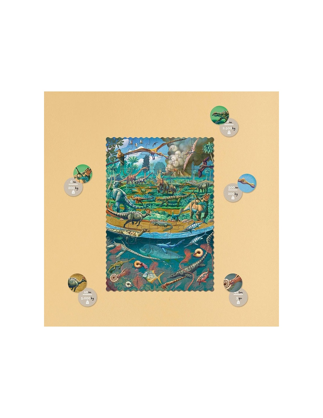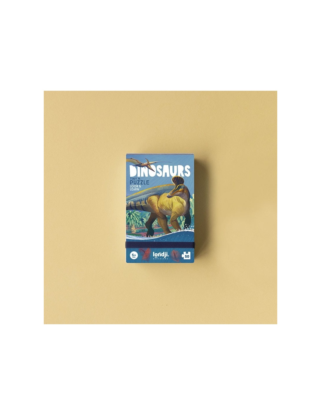 Un puzzle pequeño de 50 piezas que incluye 12 piezas para aprender sobre los dinosaurios. Un juguete educativo y sostenible, fabricado en Barcelona, de proximidad.