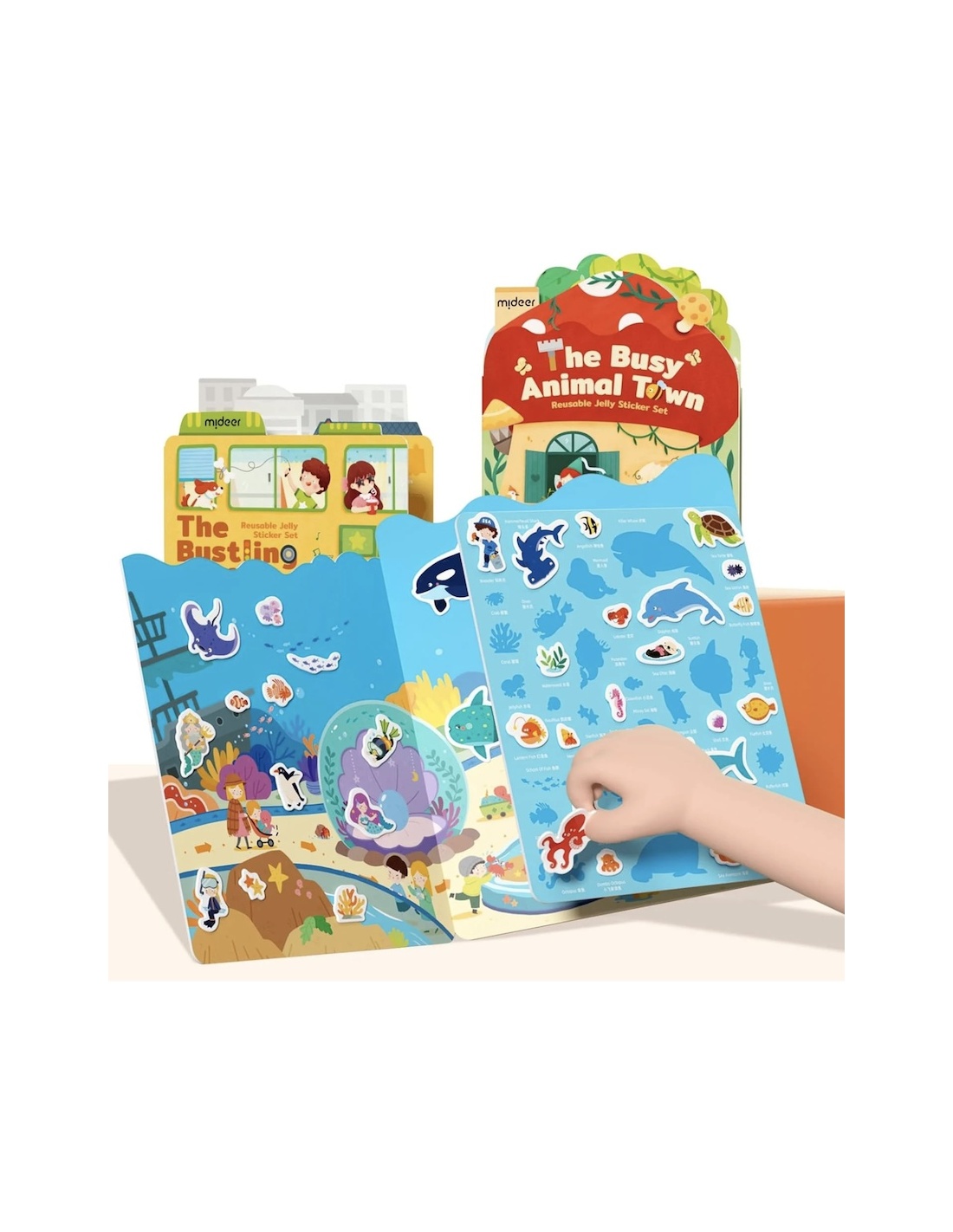 Un set con un escenario en forma de carpeta con 38 pegatinas de gel que se pegan y despegan. Su diseño favorece el libre juego creando historias del mar o aprendiendo los nombres de cada uno de los elementos marcados en las pegatinas por su nombre en inglés.