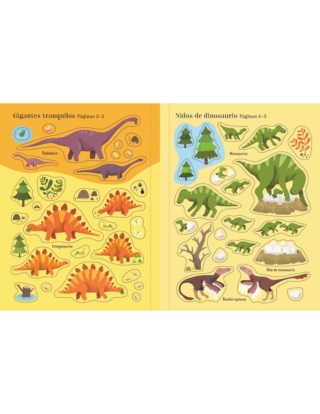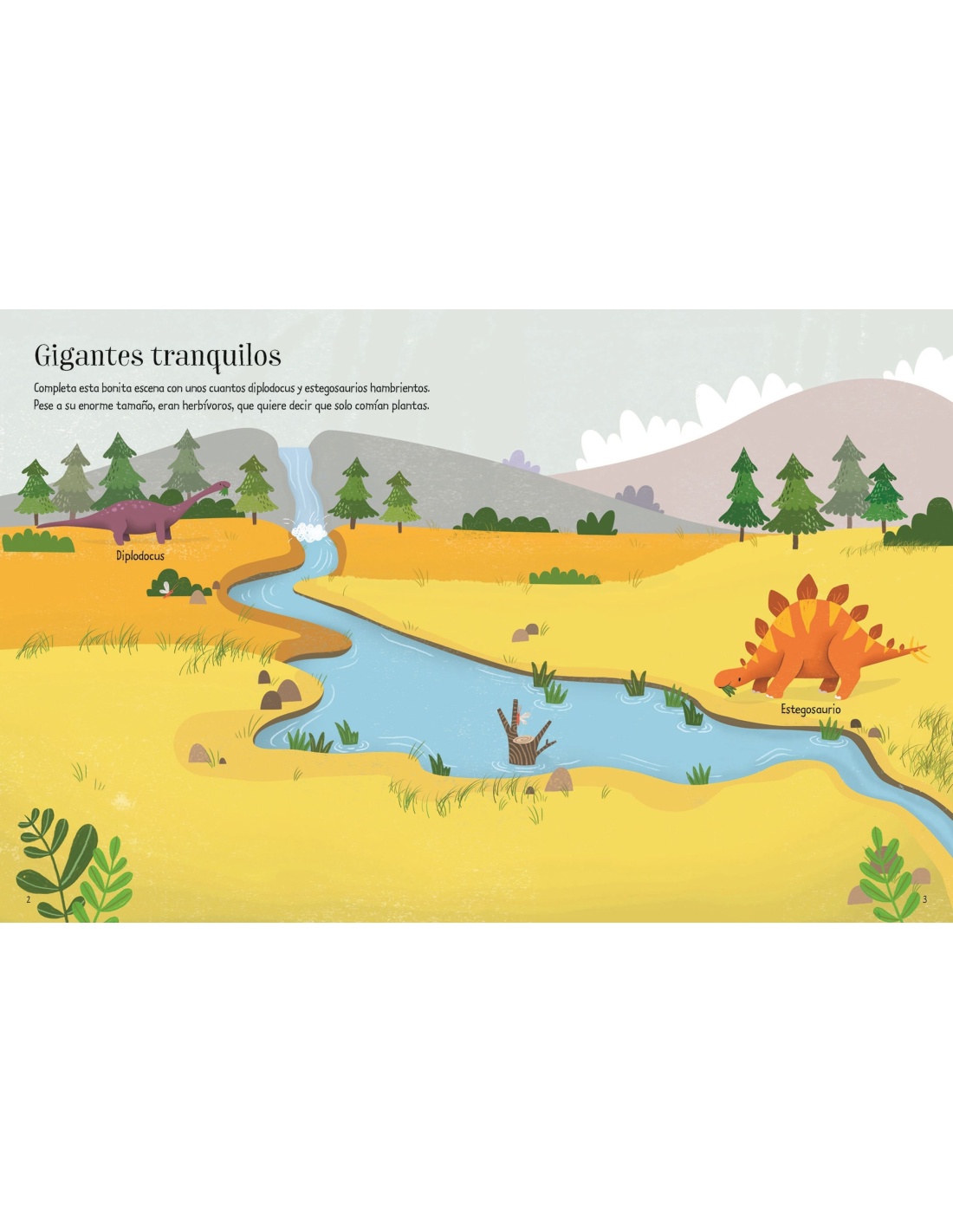 Un viaje en el tiempo hasta la era prehistórica en este libro poblado por todo tipo de dinosaurios: terrestres, marinos, voladores, carnívoros, herbívoros… Los niños completarán con pegatinas sus impresionantes escenas a la vez que descubren cómo protegía sus huevos el Maiasaura, quién escapaba del feroz T-Rex corriendo a toda velocidad sobre dos patas o qué enormes criaturas prehistóricas vivían bajo el agua.