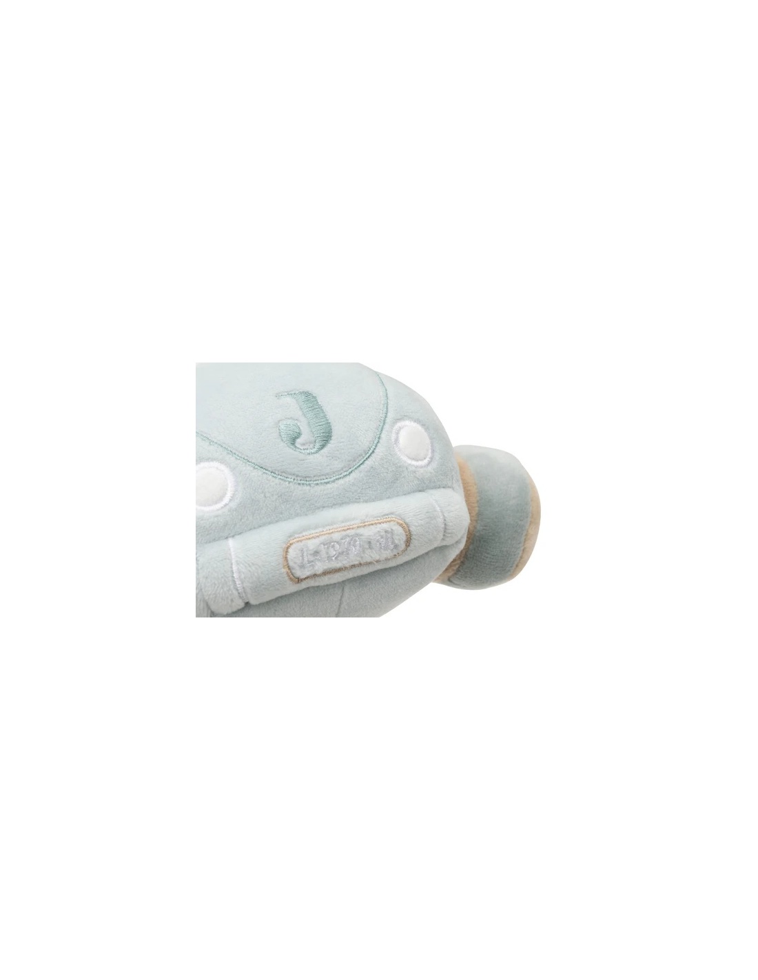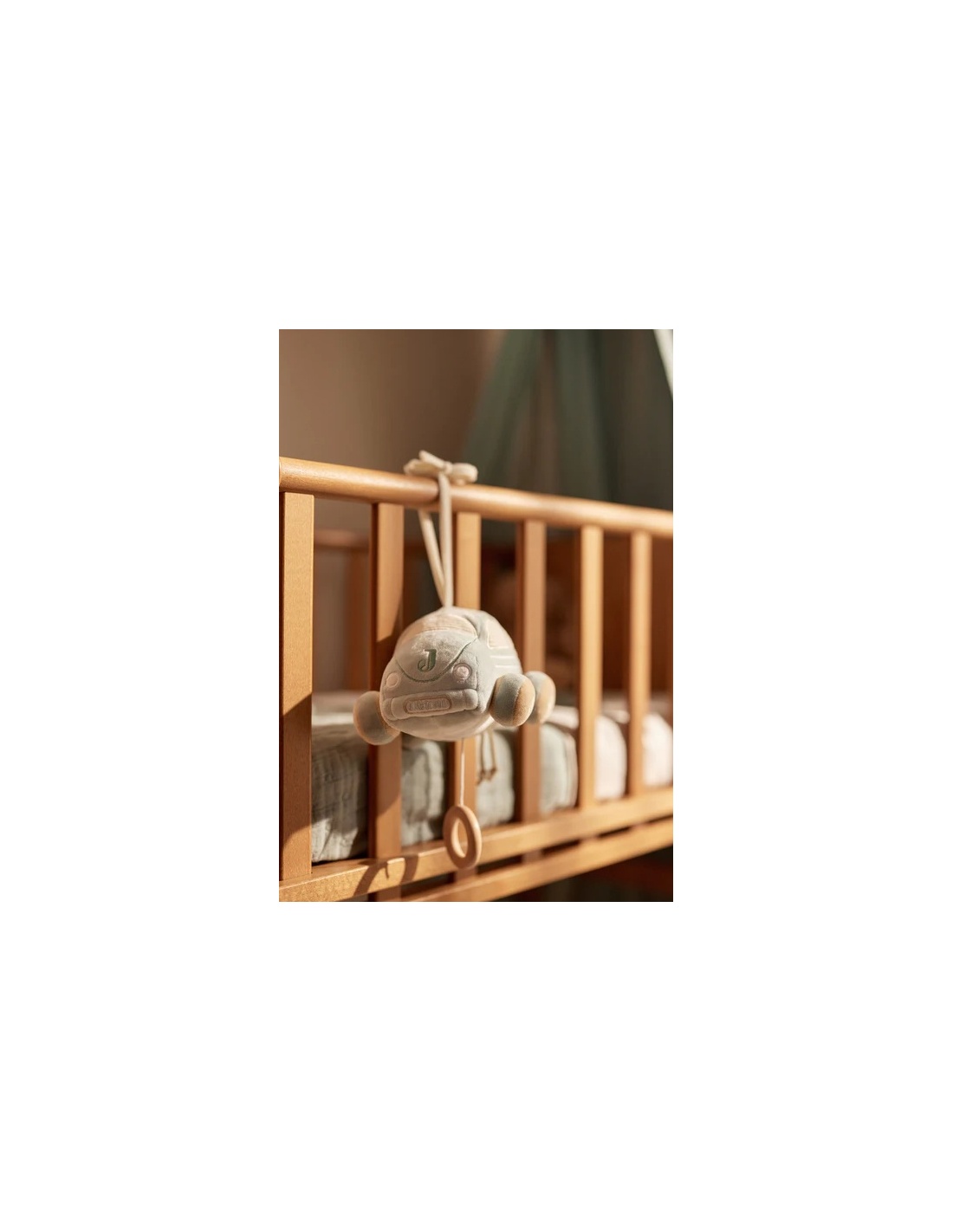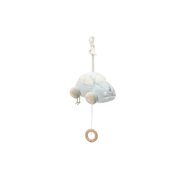 Este suave coche de color verde mar tiene ruedas en tono galleta y ventanillas de tejido acanalado. Al tirar de la cuerda, tu peque escuchará una suave nana.