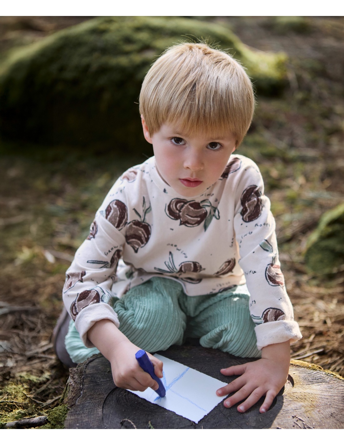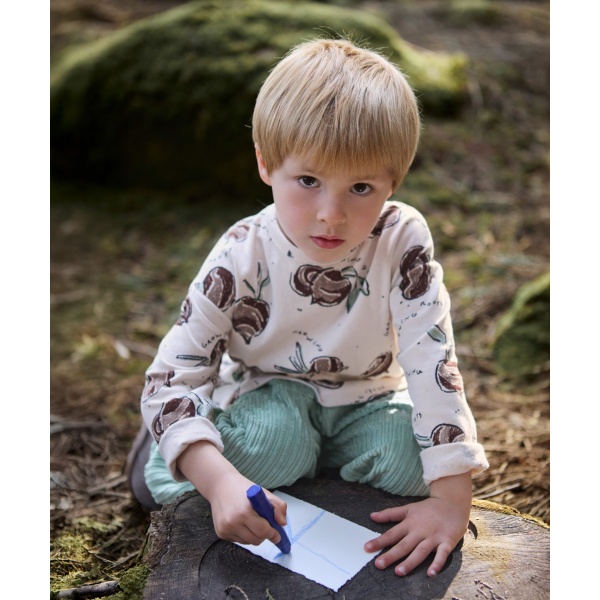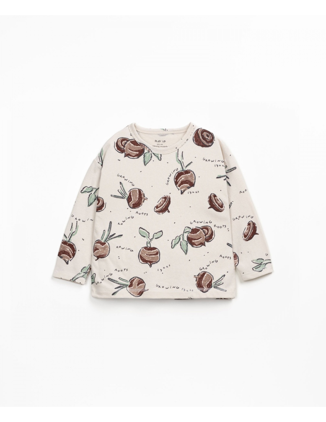Esta camiseta de punto está confeccionada con mezcla de algodón orgánico y algodón reciclado, en color Blanco Medio. Es un modelo de manga larga, cuello redondo y con nuestro estampado de remolachas.