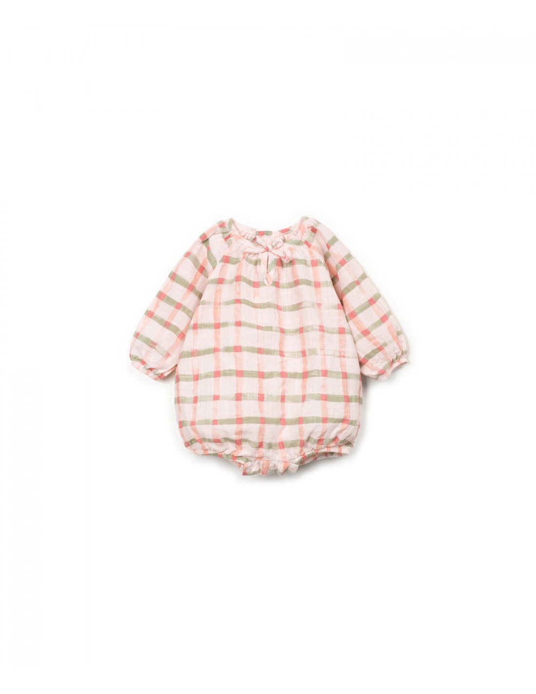 Mono estampado en tono rosa suave, confeccionado en tejido cómodo y agradable al tacto, ideal para la piel delicada del bebé. Dispone de abertura en la entrepierna con corchetes de metal sin níquel, facilitando el cambio de pañal con total comodidad y seguridad.