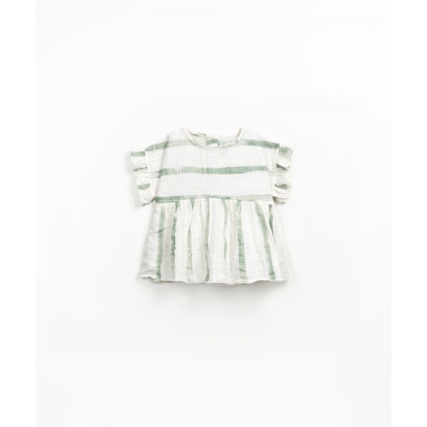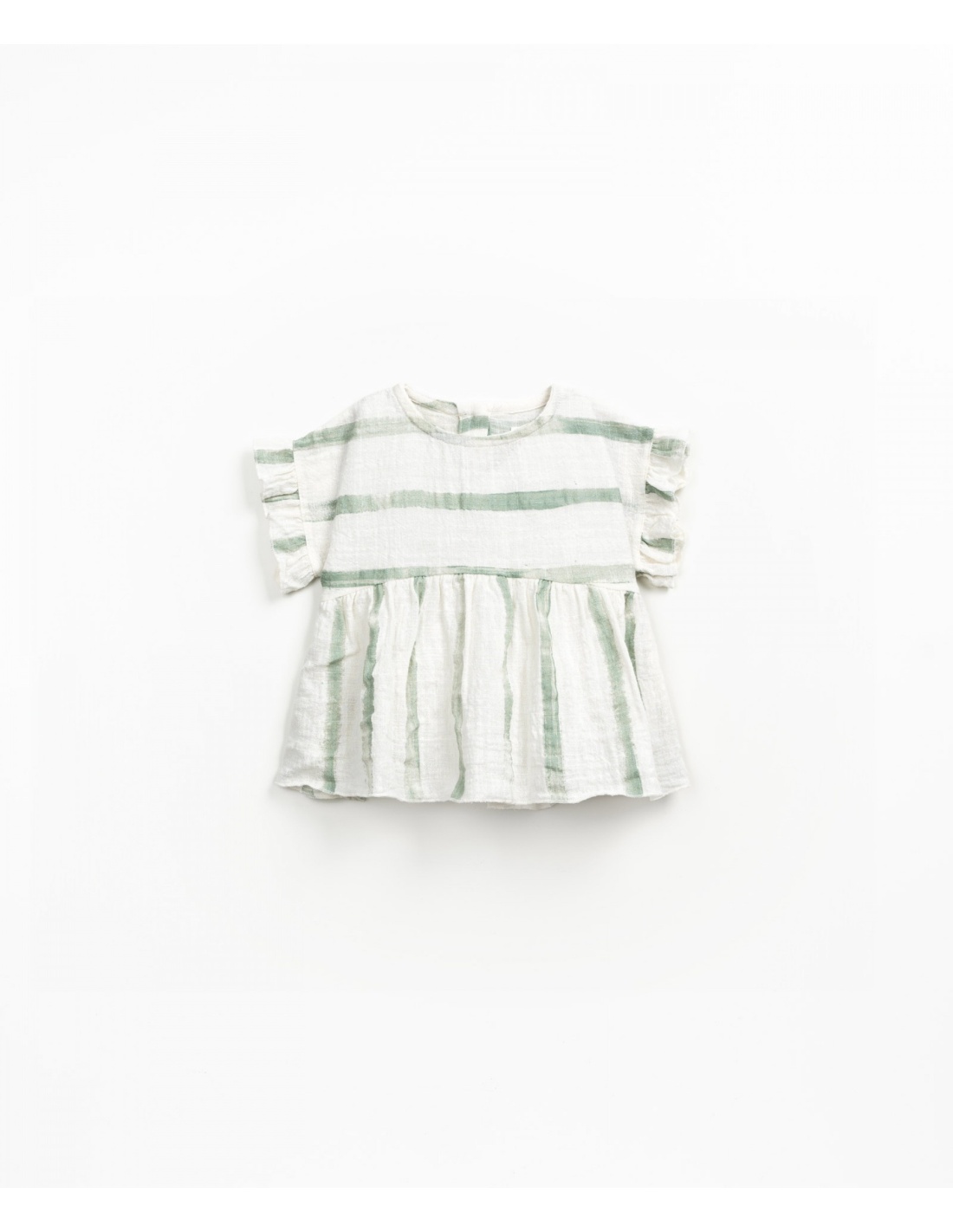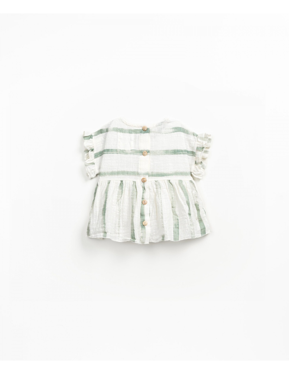 Esta túnica está confeccionada en tejido de algodón orgánico, en color Grés Raya Verde. Es un modelo de corte holgado con mangas fruncidas, rayas horizontales de diferentes grosores, abertura frontal con botones de coco y espalda más larga.