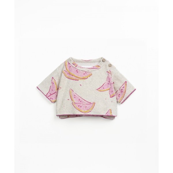 Esta sudadera está confeccionada en punto con una mezcla de algodón orgánico, algodón reciclado y poliéster reciclado. Es un modelo holgado con mangas cortas, estampado de frutas, detalles en rosa, cuello redondo, cierre con dos botones de coco en el hombro y acabado sencillo en la parte inferior.