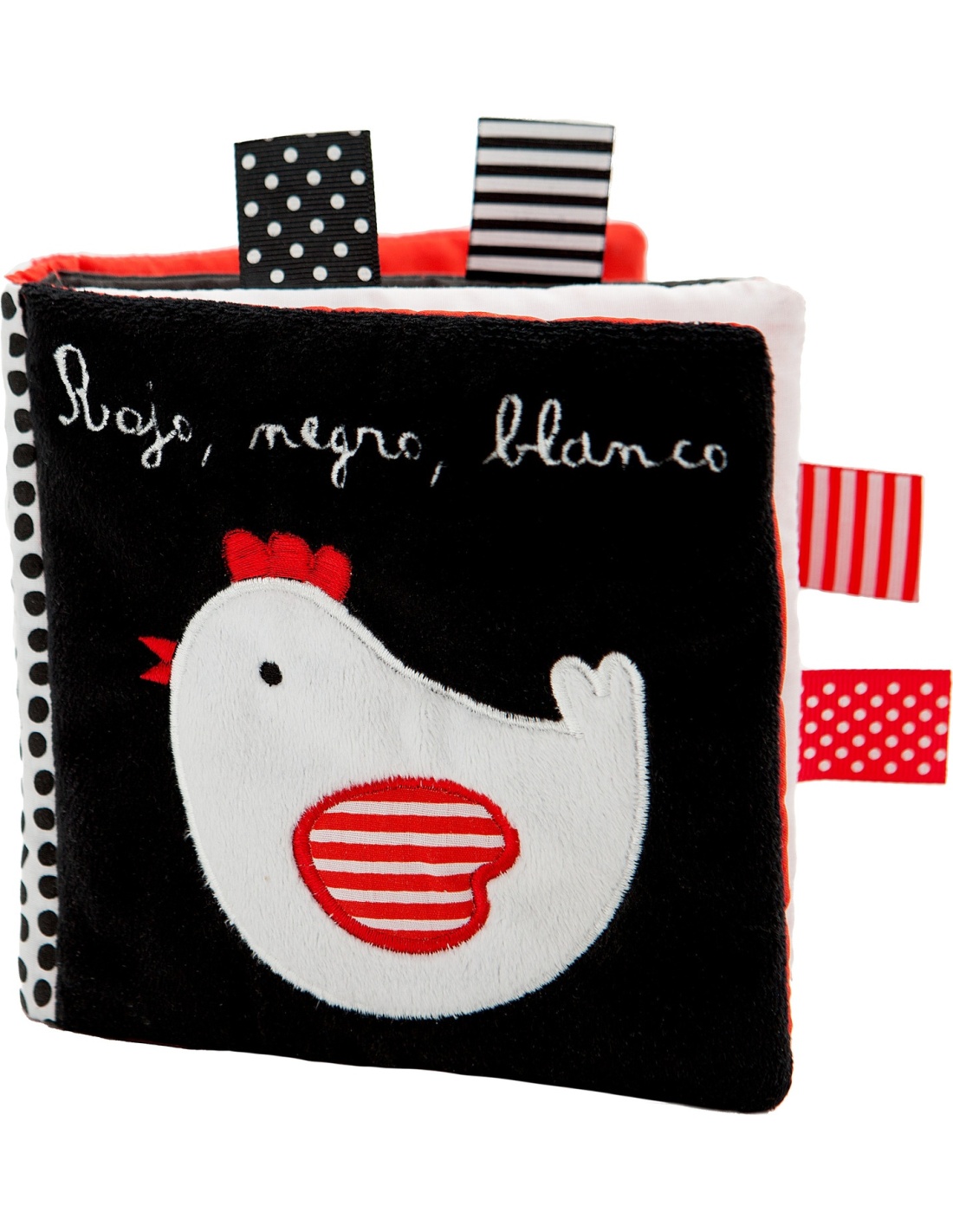 Un libro de tela con un tacto suave y un elemento sonoro en la cubierta, con páginas que hacen ruido al agarrarlas y etiquetas de colores para estimular el juego en los niños.