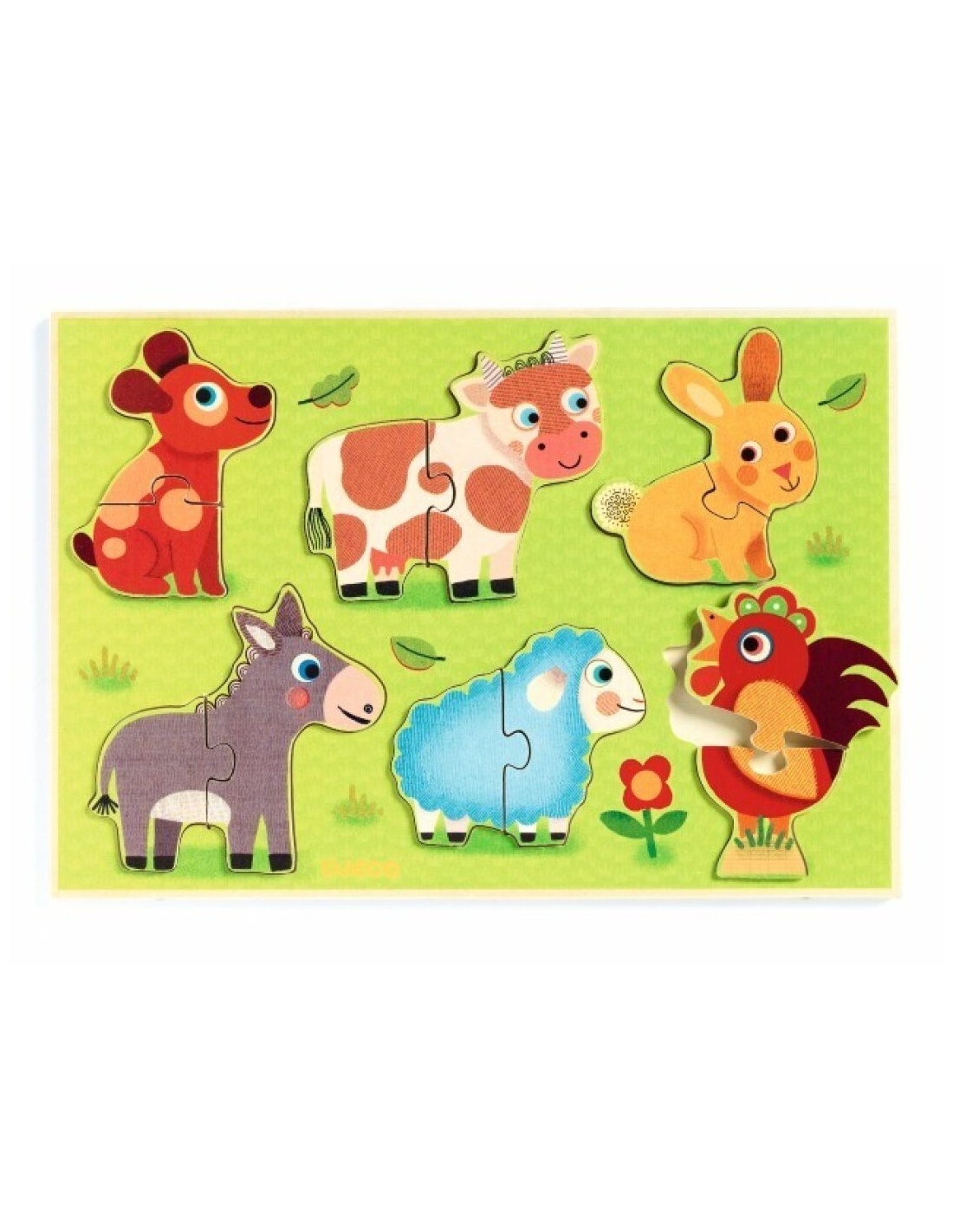 ¡Bienvenidos al mundo encantador de la granja con Coucou-cow de Djeco! Este adorable puzle de madera está especialmente diseñado para los más pequeños desde los 18 meses, y ofrece doble diversión: primero, el niño arma los 6 simpáticos animales formados por 2 piezas cada uno, y luego los encaja en su lugar en el tablero. Sus formas simples y colores vivos facilitan el juego y estimulan el reconocimiento visual, además de desarrollar la motricidad fina de manera lúdica. Hecho con materiales de calidad y pensado con ternura, este juego es perfecto para aprender, jugar y explorar el mundo de la granja desde muy temprano.