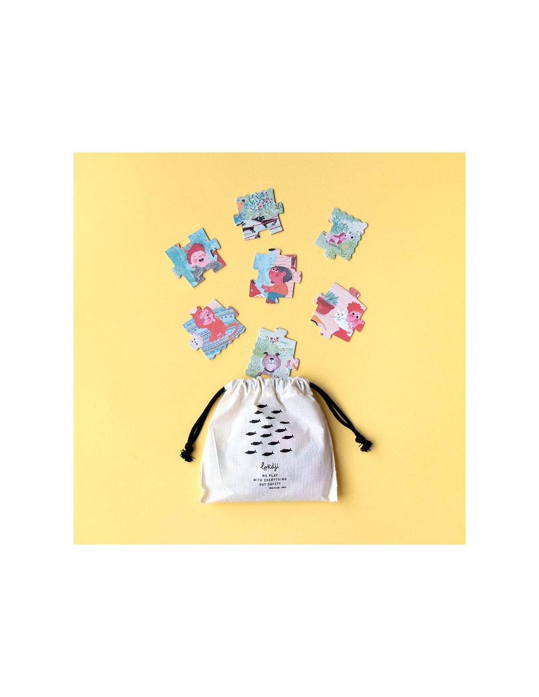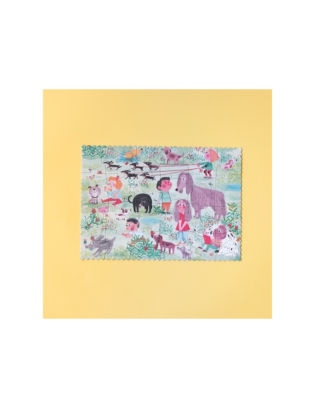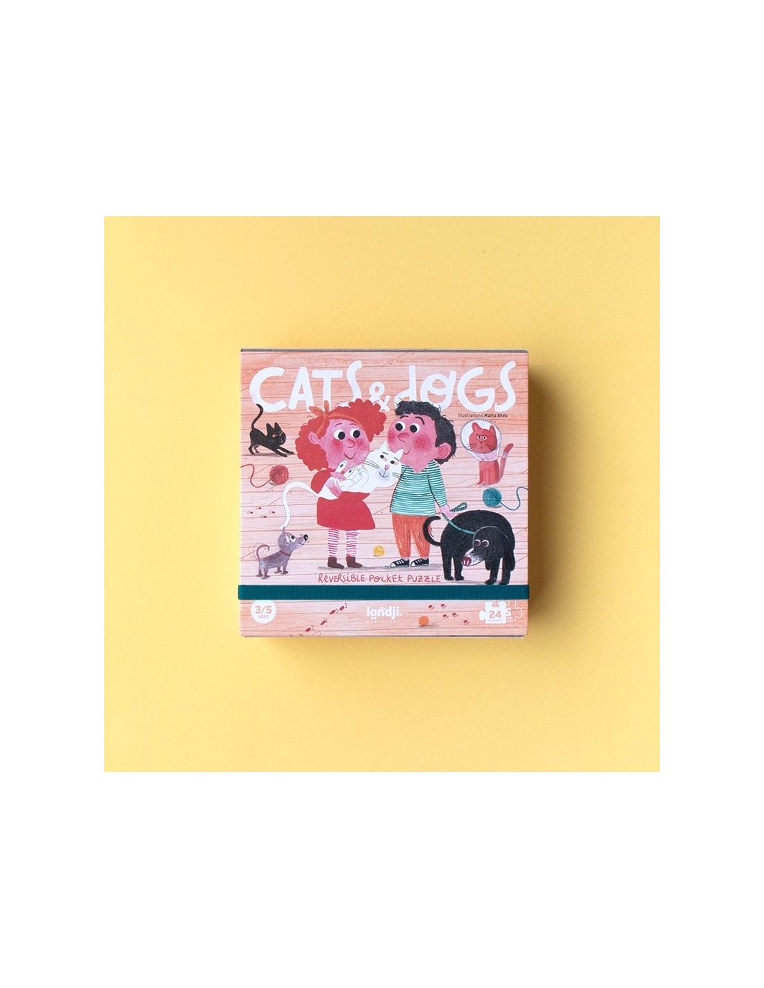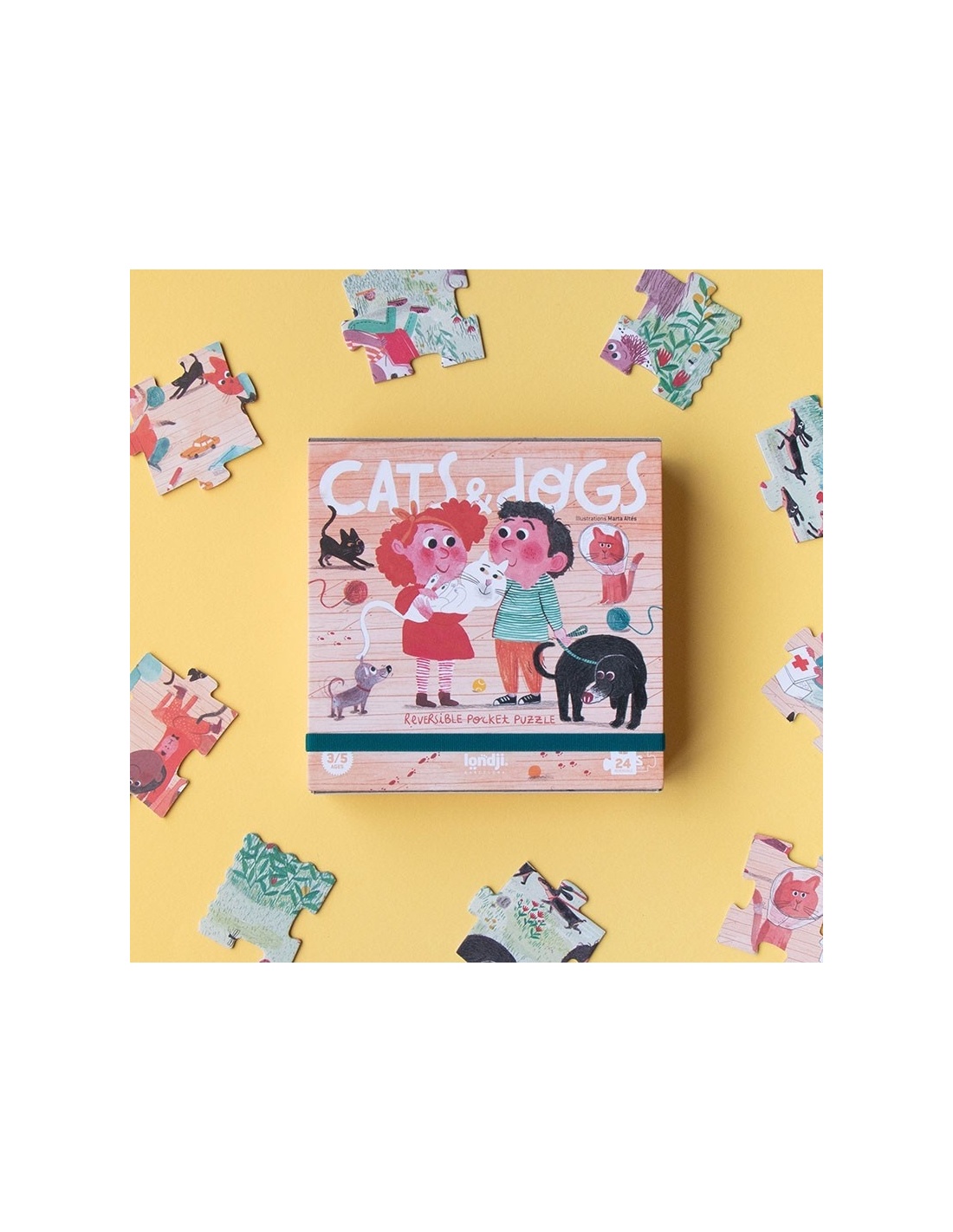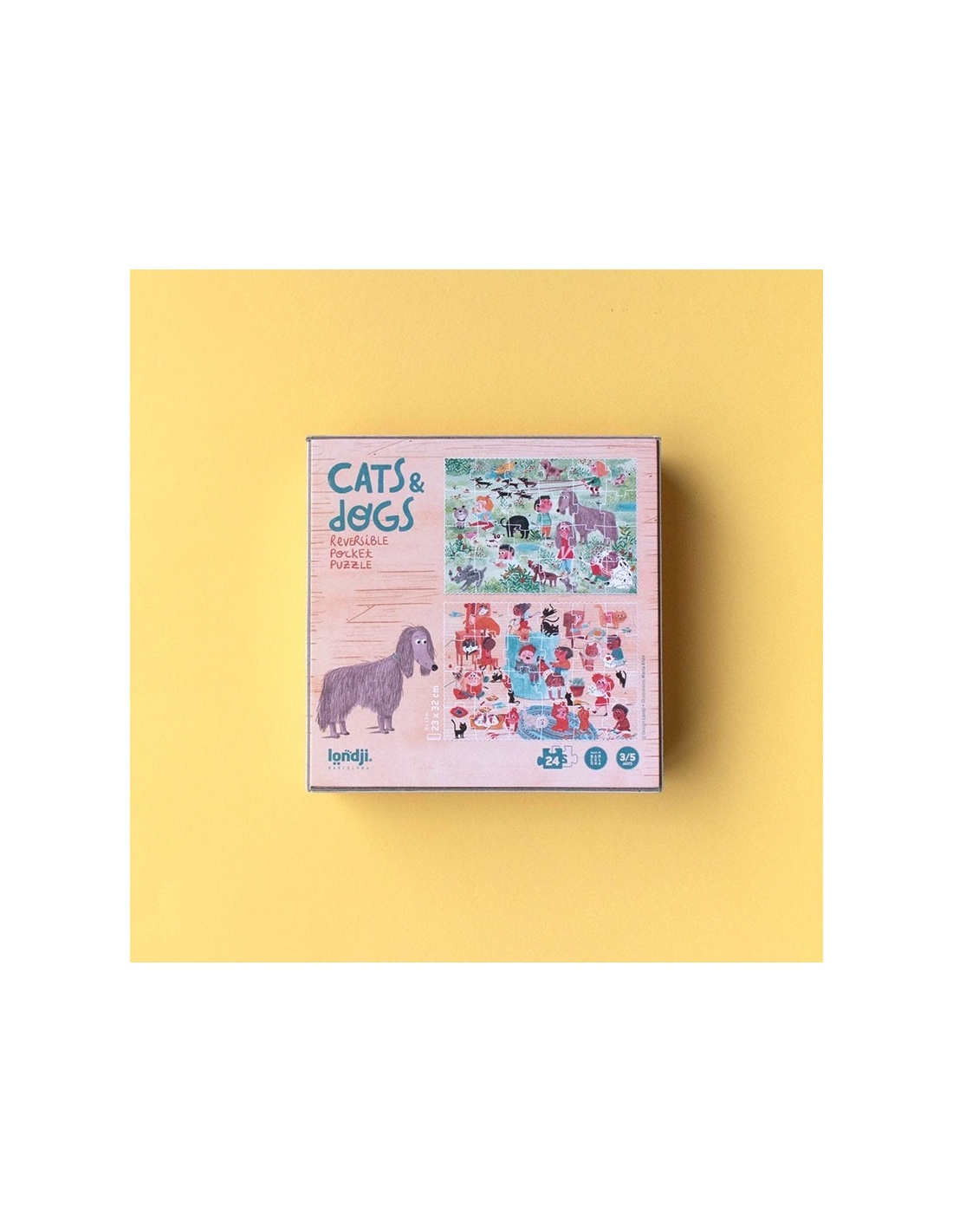 ¡Nuestros amigos peludos están listos para jugar! Este puzle reversible de 24 piezas ofrece, por un lado, una encantadora ilustración de perros y, por el otro, una divertida escena de gatos, todo en un práctico formato de viaje para llevar la diversión a cualquier parte. Ideal para acompañar a los peques en todas sus aventuras.