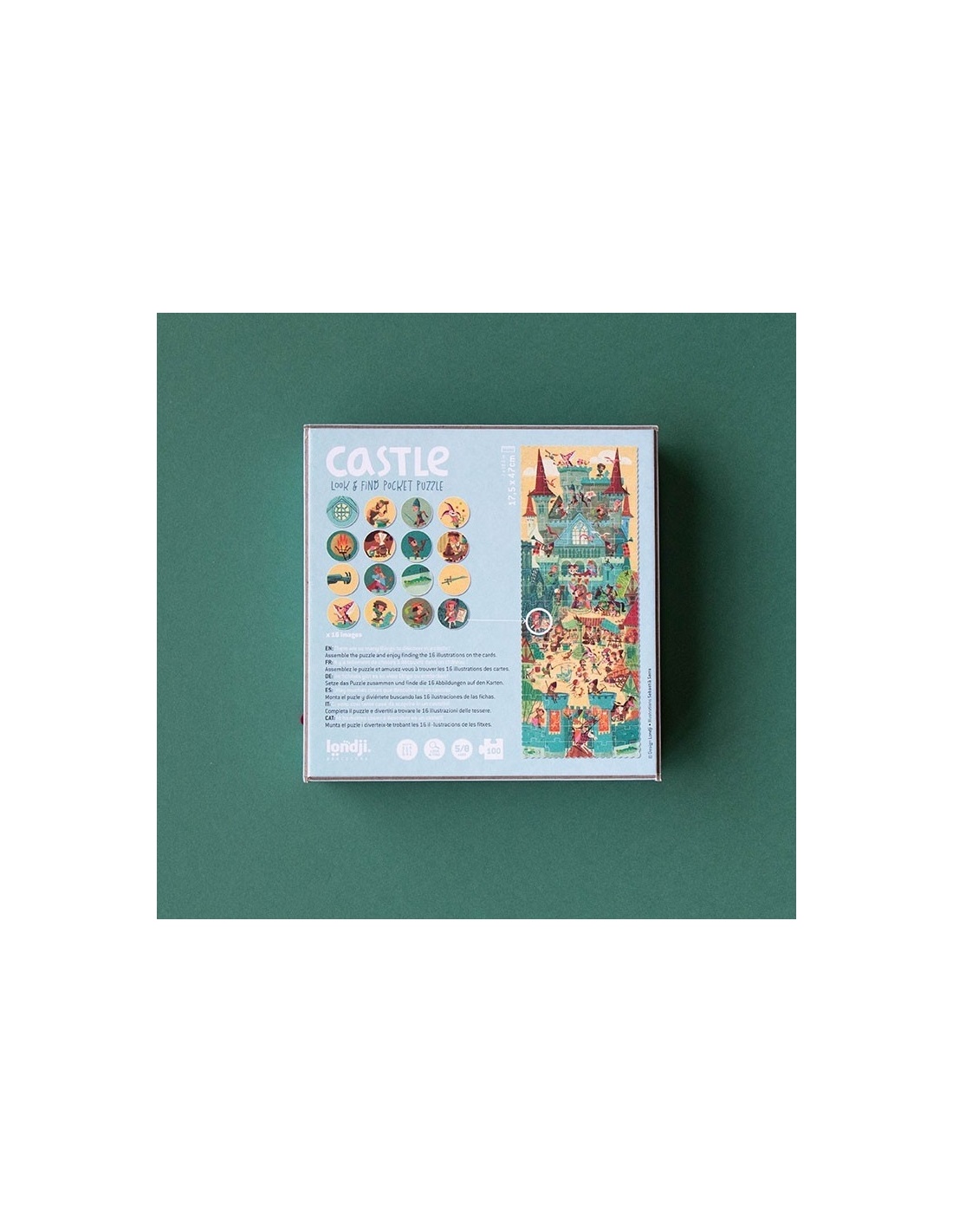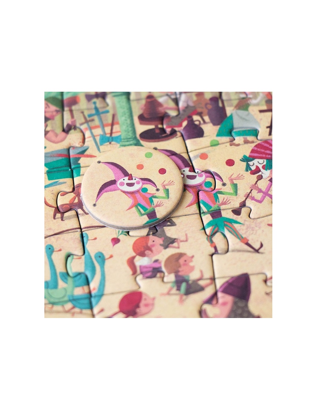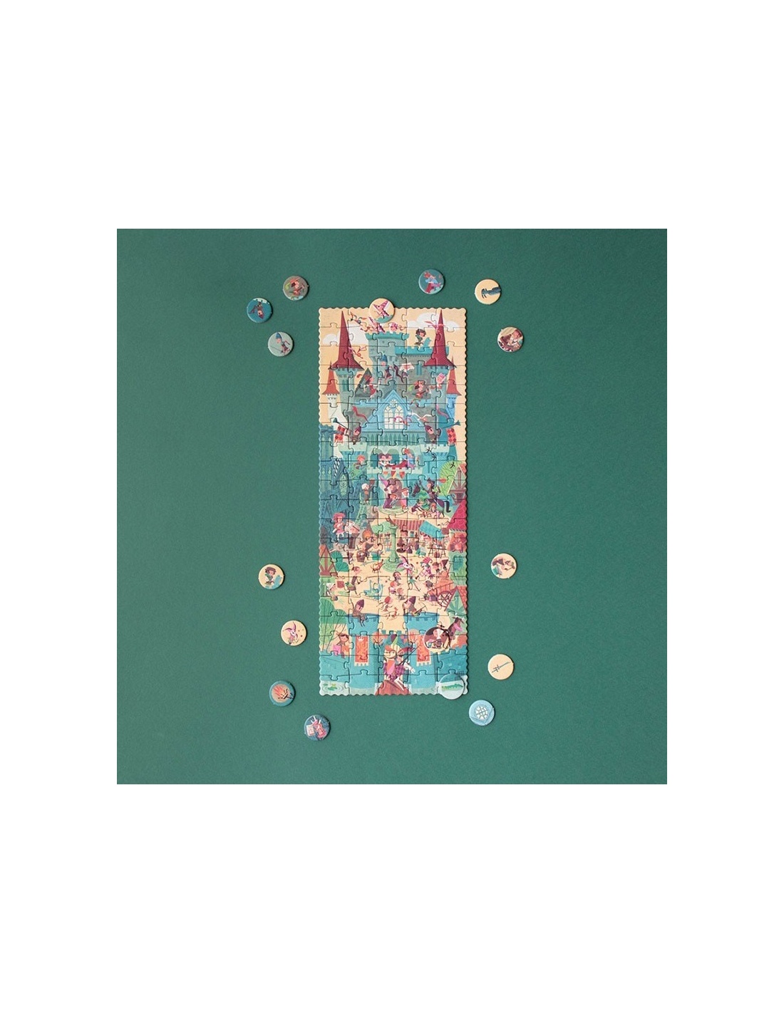 Un puzzle de 100 piezas y 16 fichas de observación para descubrir la vida en torno a un castillo medieval, para aprender historia mientras jugamos. Un juguete educativo.