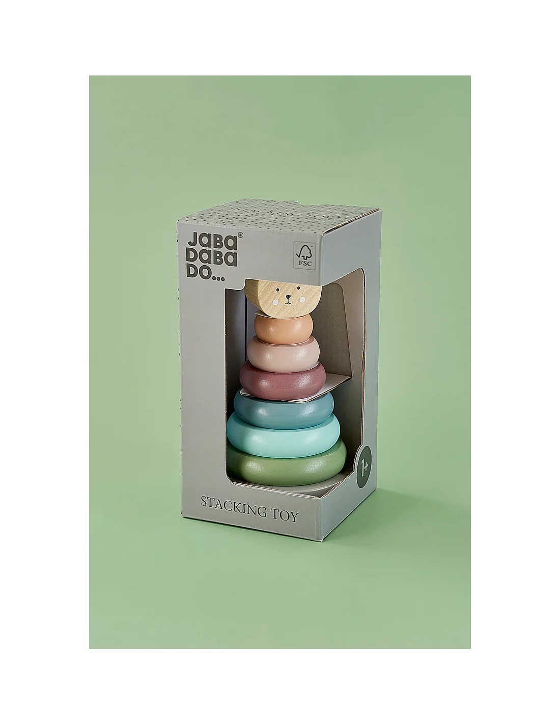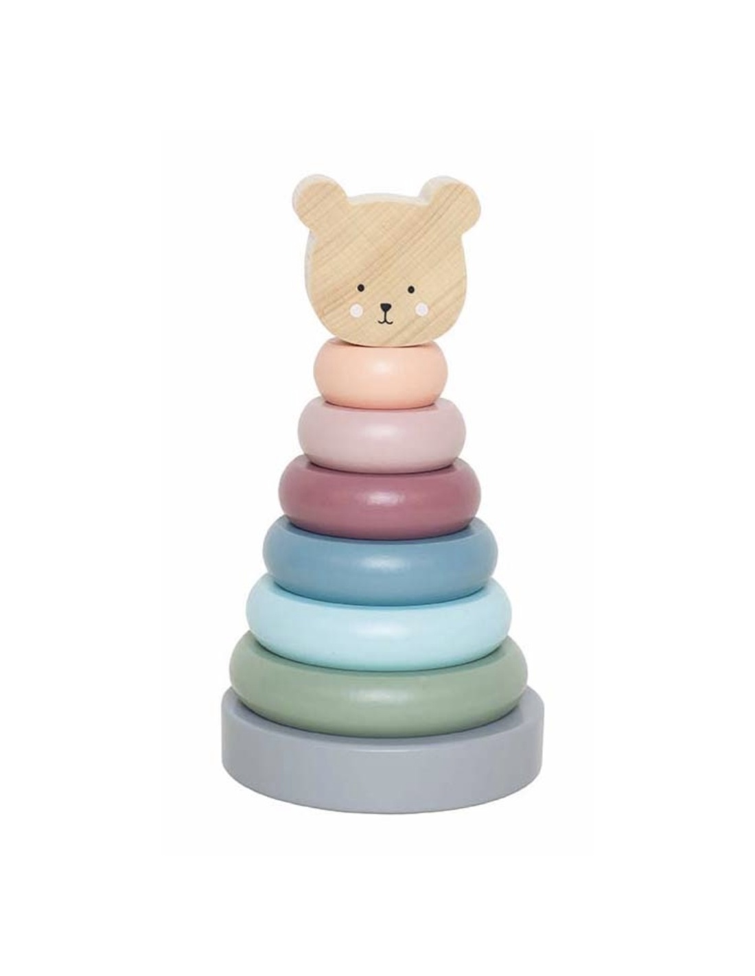 Un clásico juguete apilable en suaves colores que invita a los niños a dejar volar su creatividad, combinando y apilando los aros en distintos órdenes. Su diseño incluye una varilla segura, sujeta con una banda elástica en la base para mayor protección, y un delicado acabado en tonos naturales que lo convierte en un juguete atemporal, ideal tanto para jugar como para decorar.