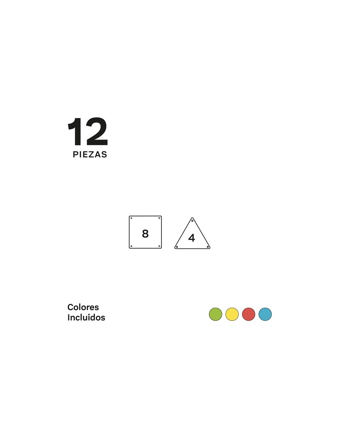 Contenido: 12 piezas, con 8 cuadrados y 4 triángulos de diferentes colores.