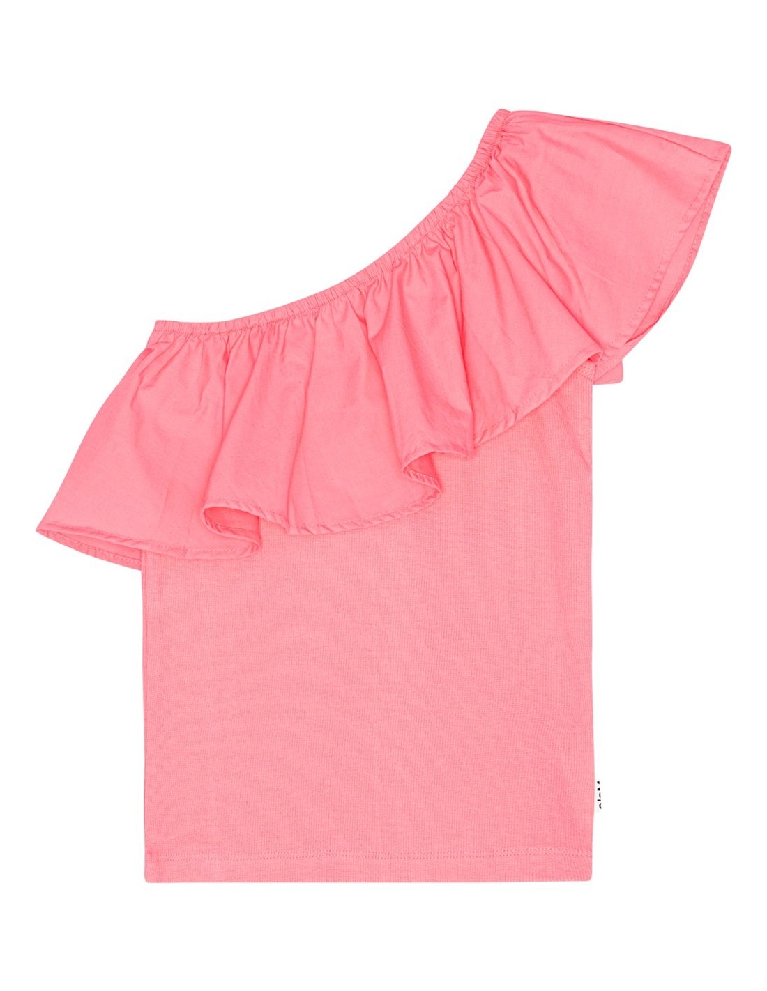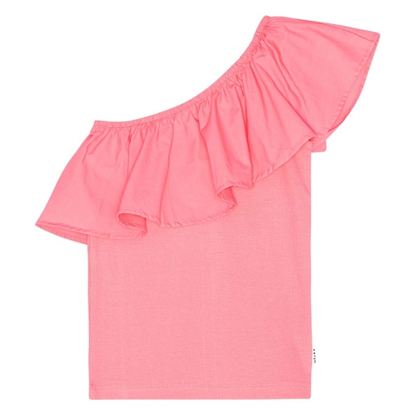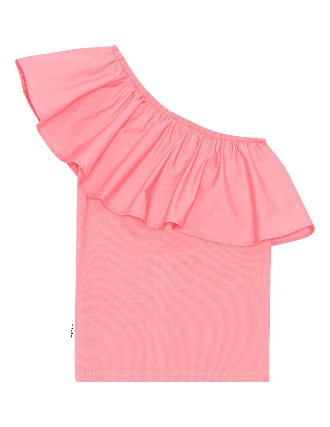 Top rosa de un solo hombro de algodón orgánico con elástico. El top es de corte ceñido y tiene un amplio volante de popelina en el cuello.