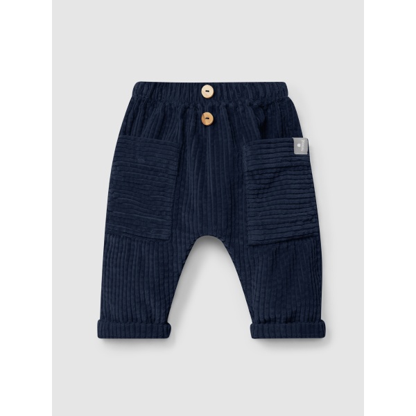 Pantalón pull-up de terciopelo acanalado 100% algodón orgánico con bolsillos funcionales al frente. La bota se puede utilizar doblada o entera para mayor durabilidad. Botones decorativos de madera en la cintura.