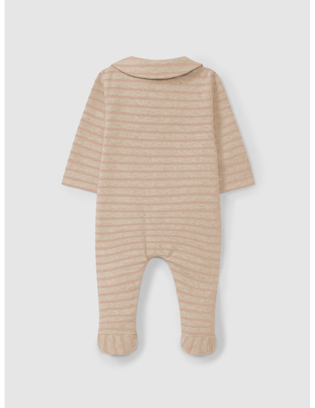 Con un delicado estampado a rayas y cuello tipo Peter Pan que aporta un toque clásico y encantador. Diseñado sin costuras laterales para mayor suavidad y confort. Se abre completamente al frente con botones de madera y cuenta con broches en la entrepierna en uno de los lados para facilitar el cambio.