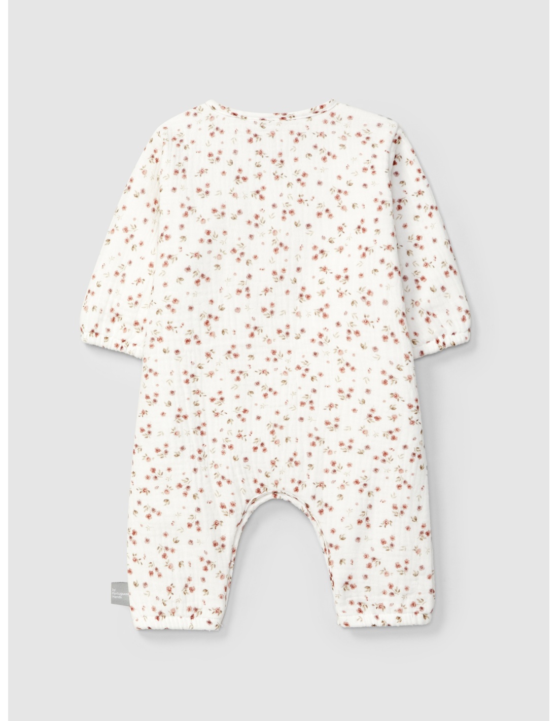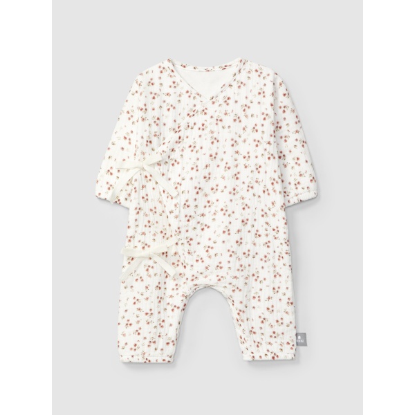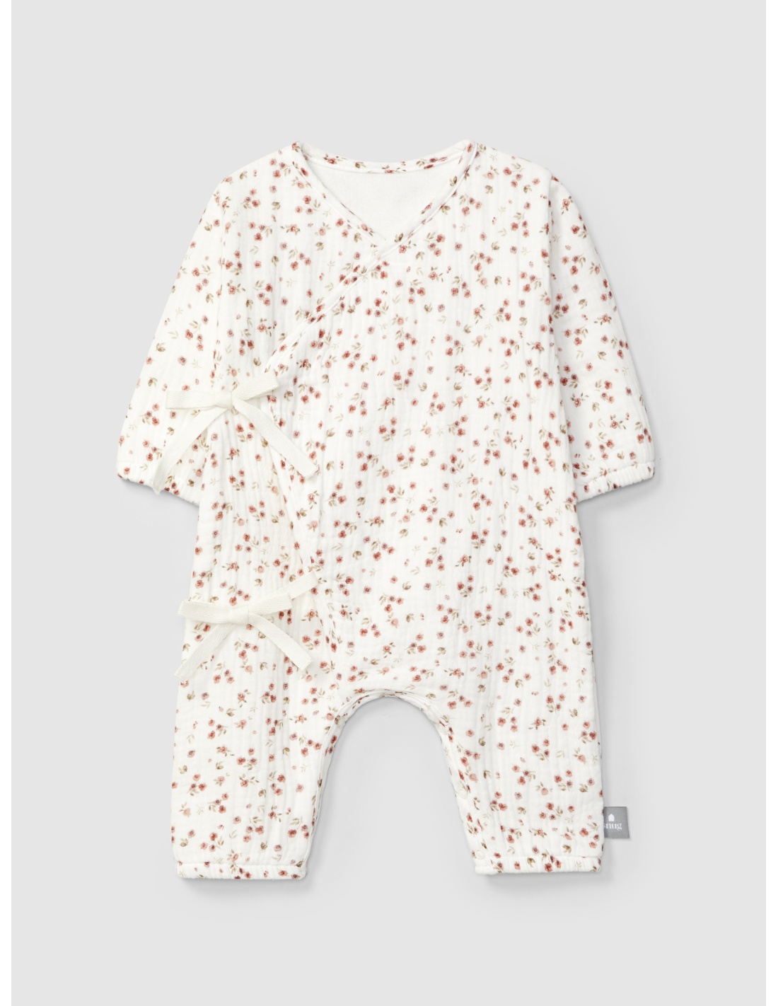 Ranita estampada de muselina 100% algodón, totalmente forrada con cálido punto de algodón. Cierre cruzado con lazo decorativo en el exterior y corchetes en el interior y entre las piernas para facilitar el cambio.