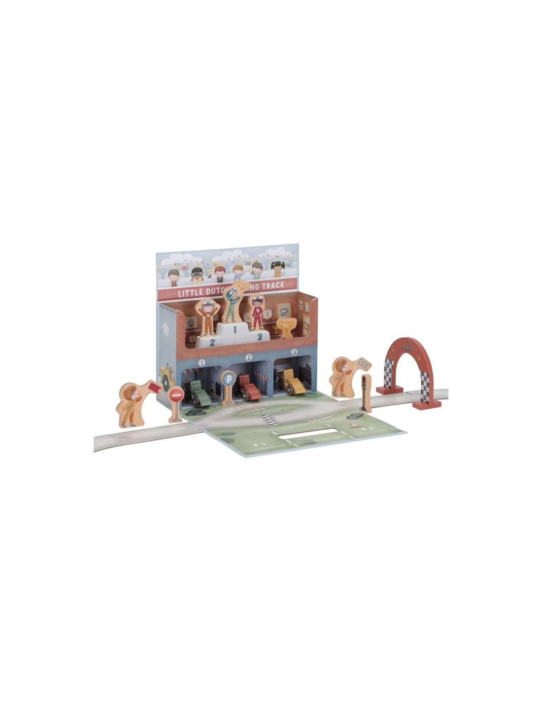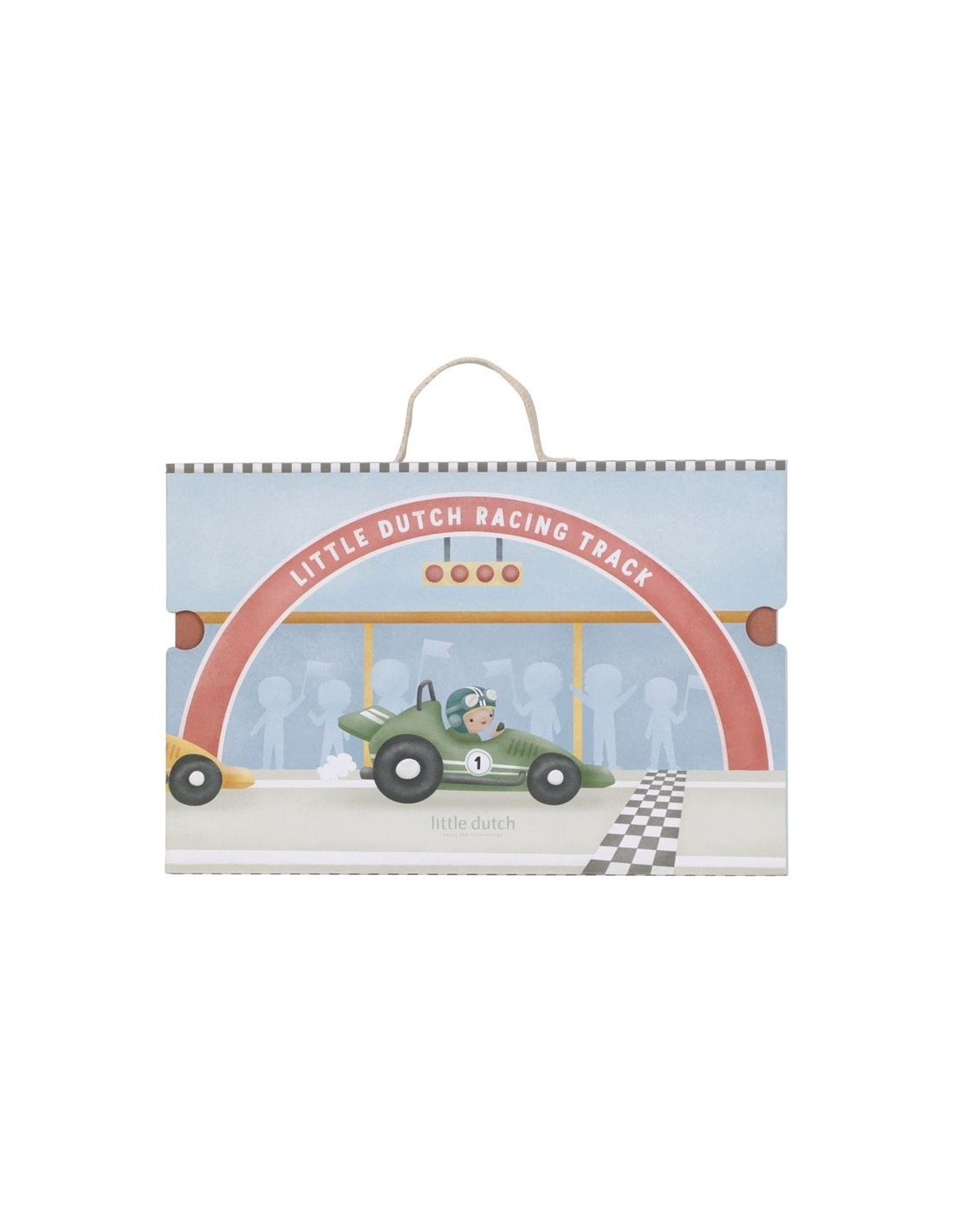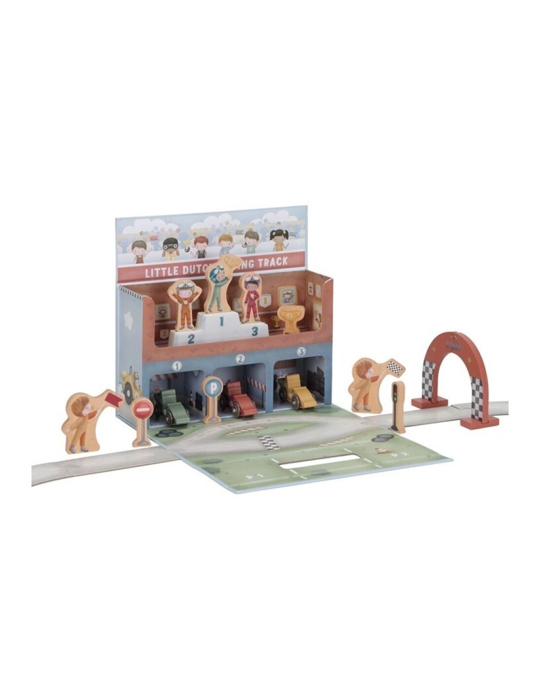 ¡Arranquen motores! Este estuche de cartón se transforma en una pista de carreras completa. El set incluye todo lo necesario para una carrera emocionante: coches de carreras, pilotos, una línea de meta, señales de tráfico, un trofeo y un podio de ganadores. La pista de cartón consta de piezas independientes que se ensamblan fácilmente como un rompecabezas. Después de la carrera, puedes guardar todo cuidadosamente en el estuche. ¿Listo para la siguiente carrera?