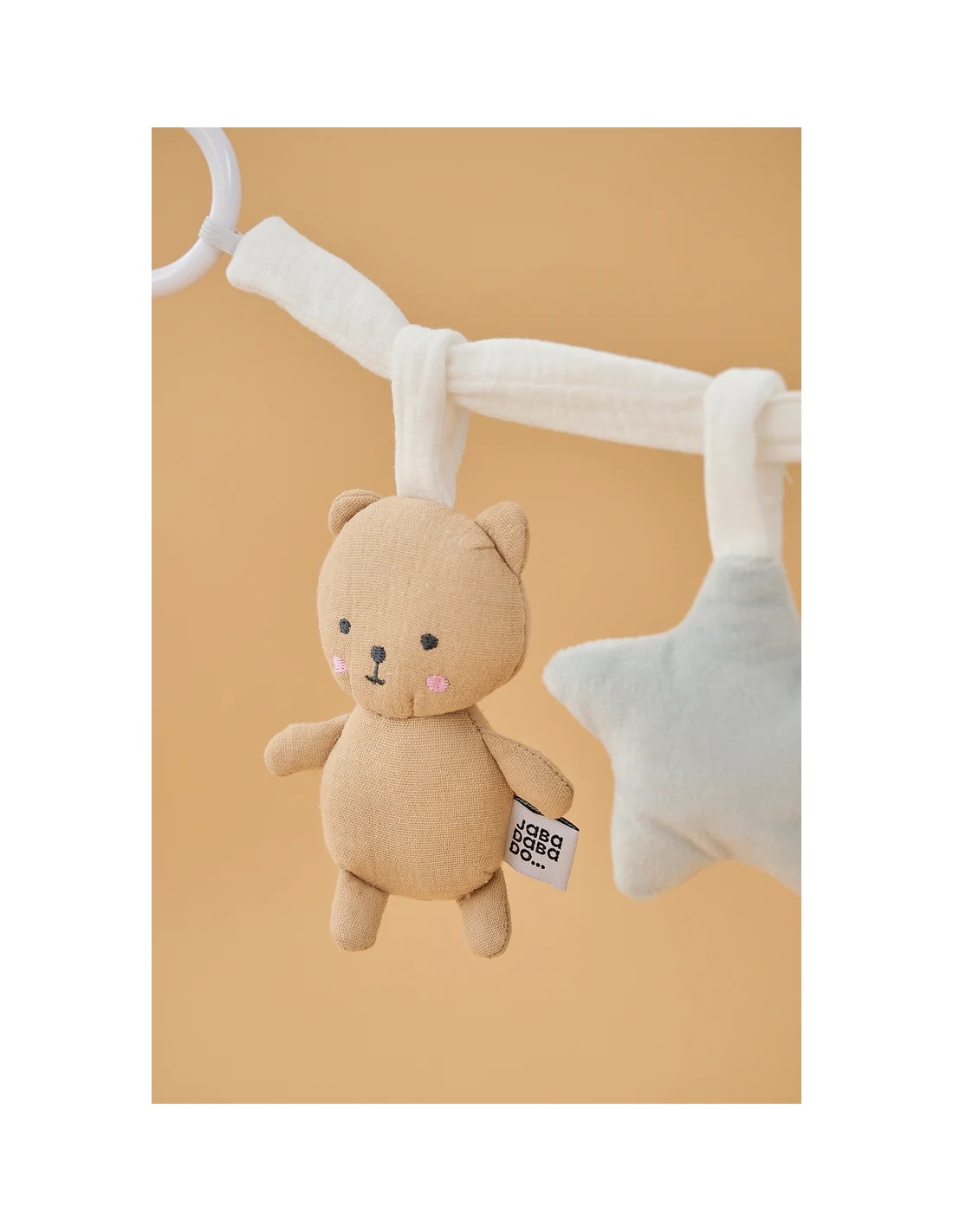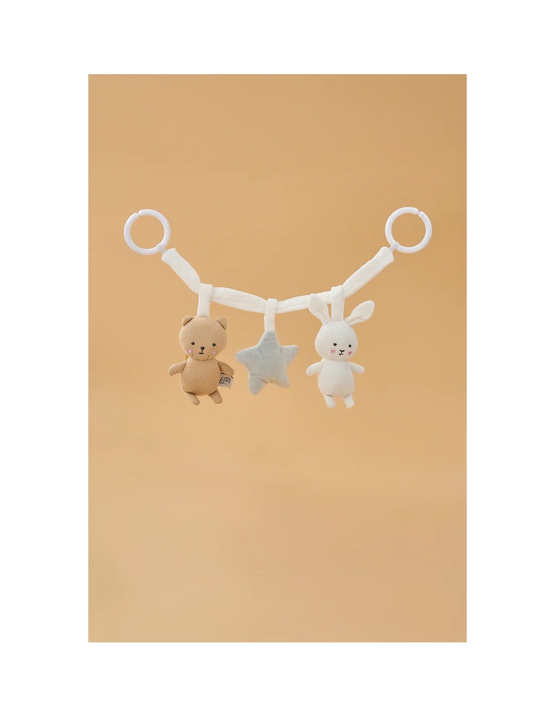 Dulce juguete para cochecito con adorables ositos y conejitos. El juguete entretiene al bebé durante los paseos y crea una sensación de alegría y confort. Se engancha fácilmente gracias a su cuerda elástica de plástico y es adecuado para la mayoría de los cochecitos.