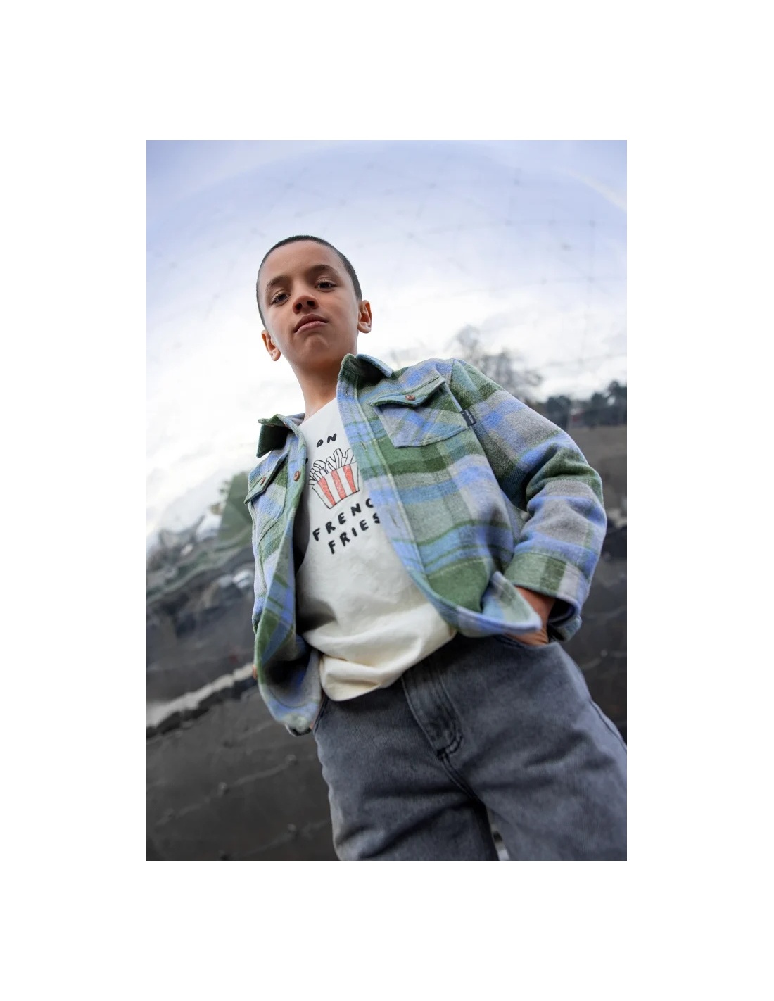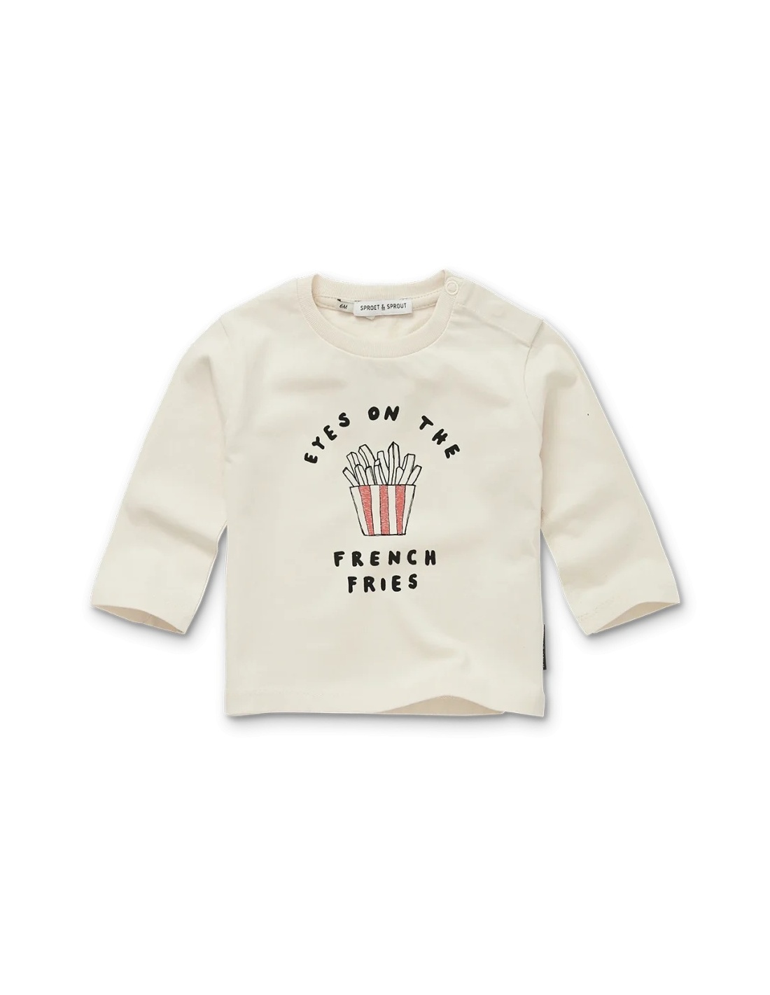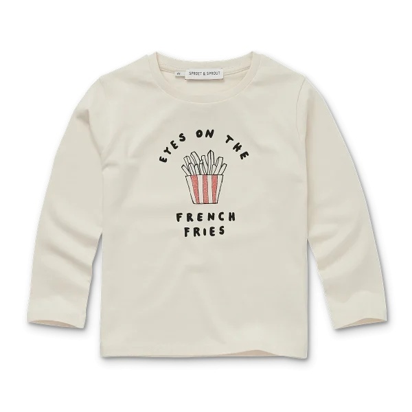 Confeccionada en suave algodón orgánico, esta camiseta de manga larga en tono blanco hueso combina comodidad y estilo con nuestro divertido estampado ilustrado a mano “Eyes on the Fries”. Su diseño alegre y original refleja ese encanto perfecto–imperfecto que hace único a tu pequeño. Además, cuenta con prácticos broches en el hombro izquierdo hasta la talla 2 años para facilitar el vestir día a día.