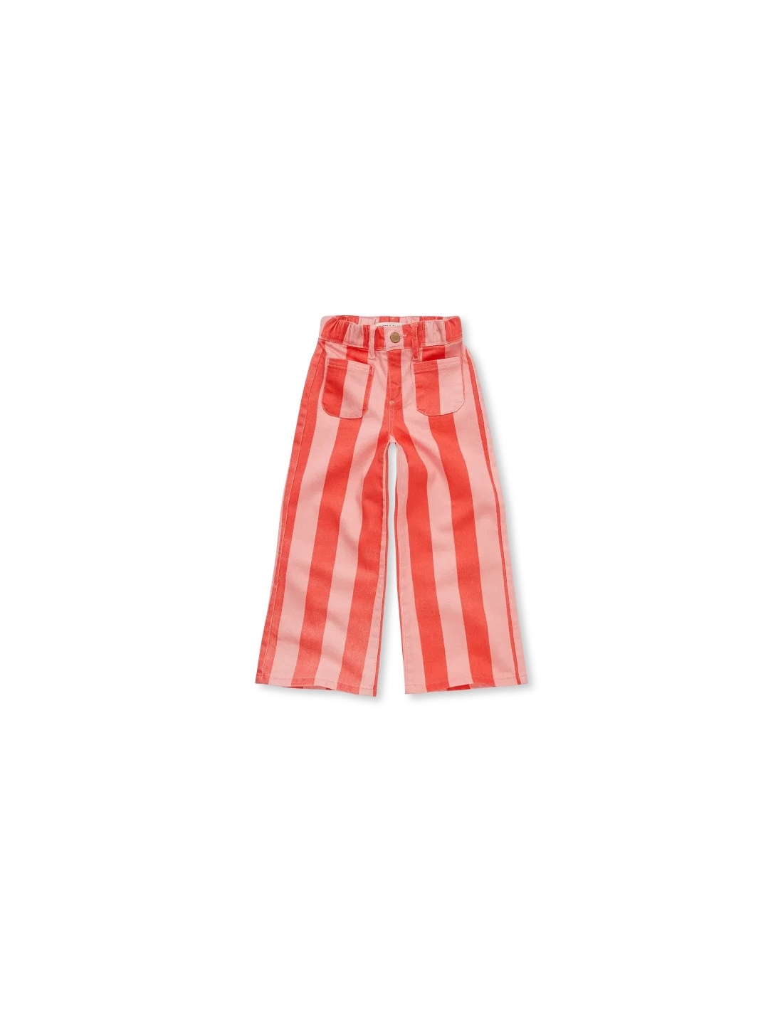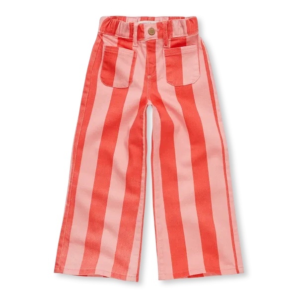 Rayas audaces se encuentran con el denim atemporal. Estos jeans acampanados en color granadina aportan energía al día a día: lo suficientemente resistentes para jugar y lo suficientemente estilosos para cualquier ocasión. Además, cuentan con una cinta ajustable en el interior de la cintura, ofreciendo un ajuste personalizado a medida que tu hijo crece.