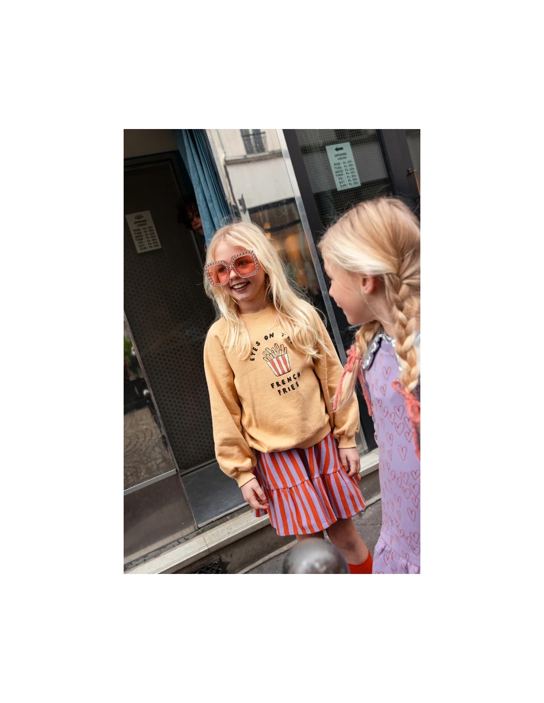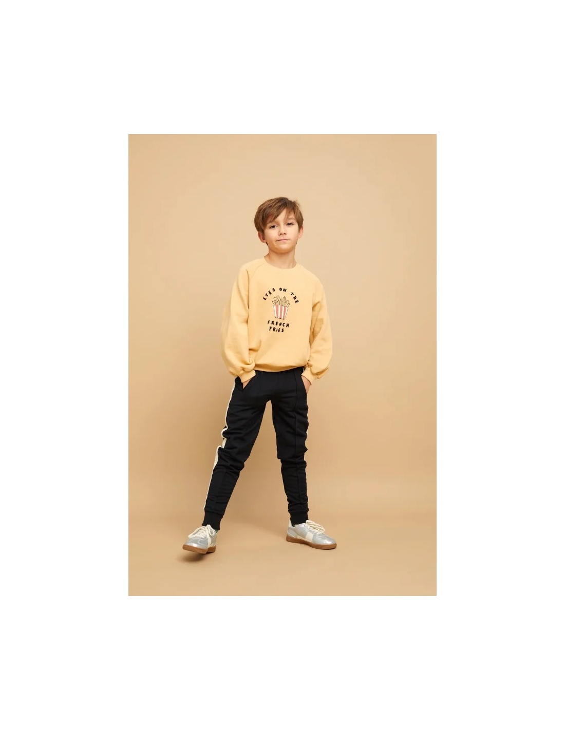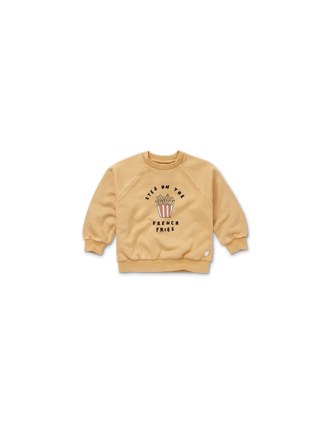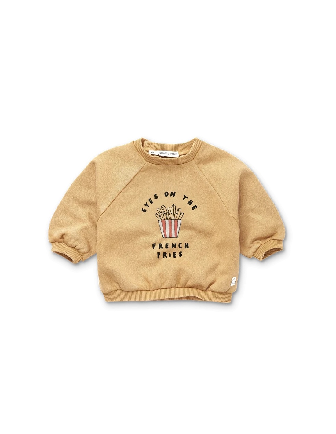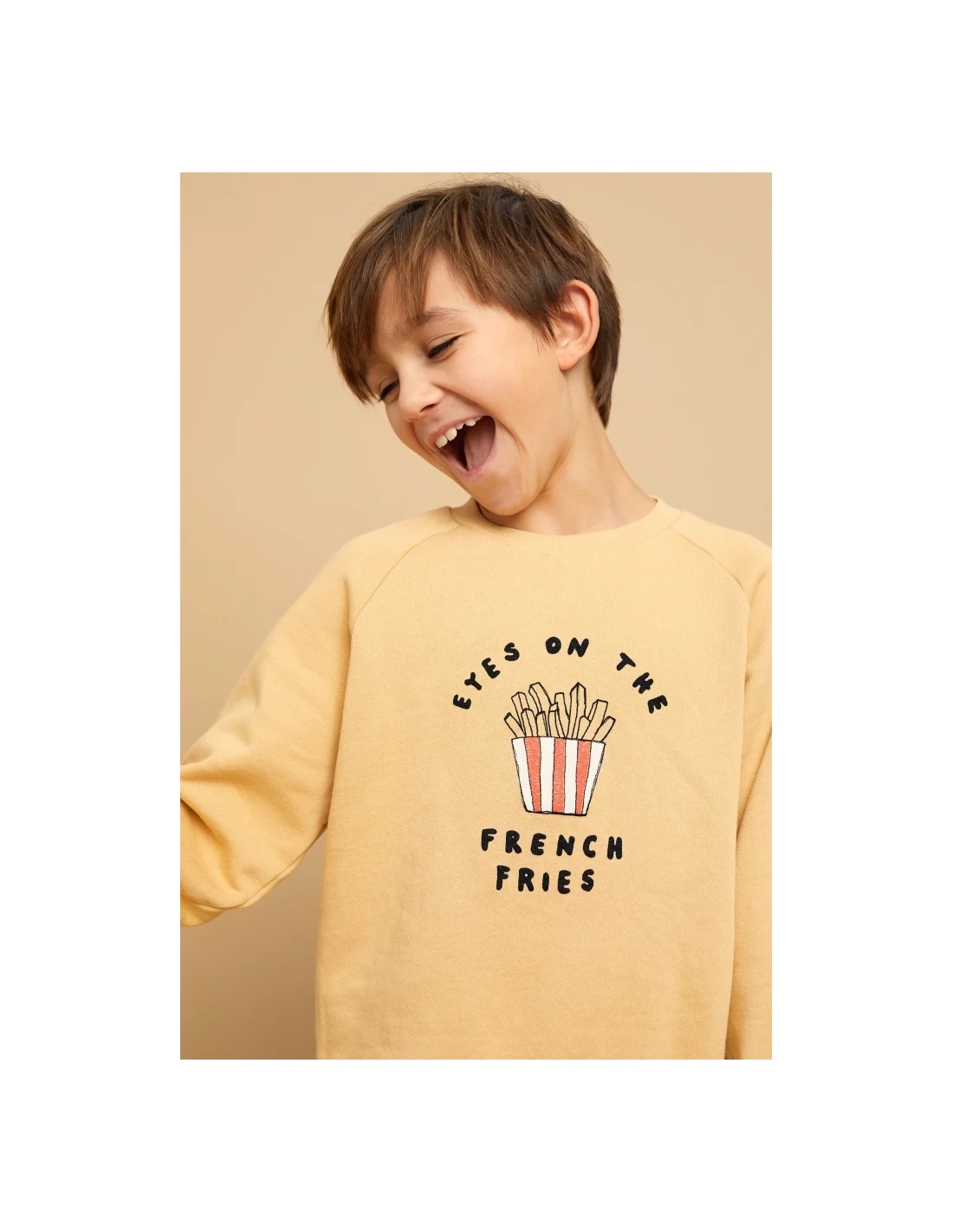 Esta sudadera en color arena está confeccionada en algodón orgánico cepillado para una sensación súper suave. Presenta un divertido estampado en el pecho “Eyes on the French Fries”, perfecta para combinar con los pantalones de chándal negros o los sudaderos morados.