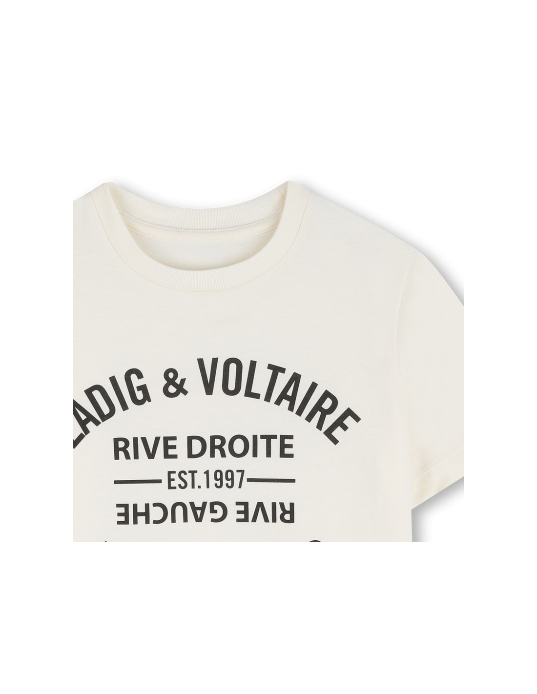 Despierta el espíritu creativo de tu pequeño con esta camiseta atemporal de cuello redondo, adornada con el icónico logotipo de ZADIG&VOLTAIRE. Esta prenda combina comodidad y estilo para acompañar las pequeñas aventuras del día a día, mientras que su corte moderno y mangas cortas ofrecen una libertad de movimiento ideal para jugar y divertirse. Una pieza imprescindible que aporta carácter y resalta la singularidad de tu hijo, perfecta para sumar estilo a su armario cotidiano.