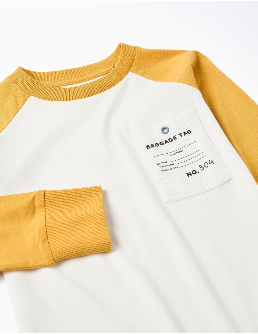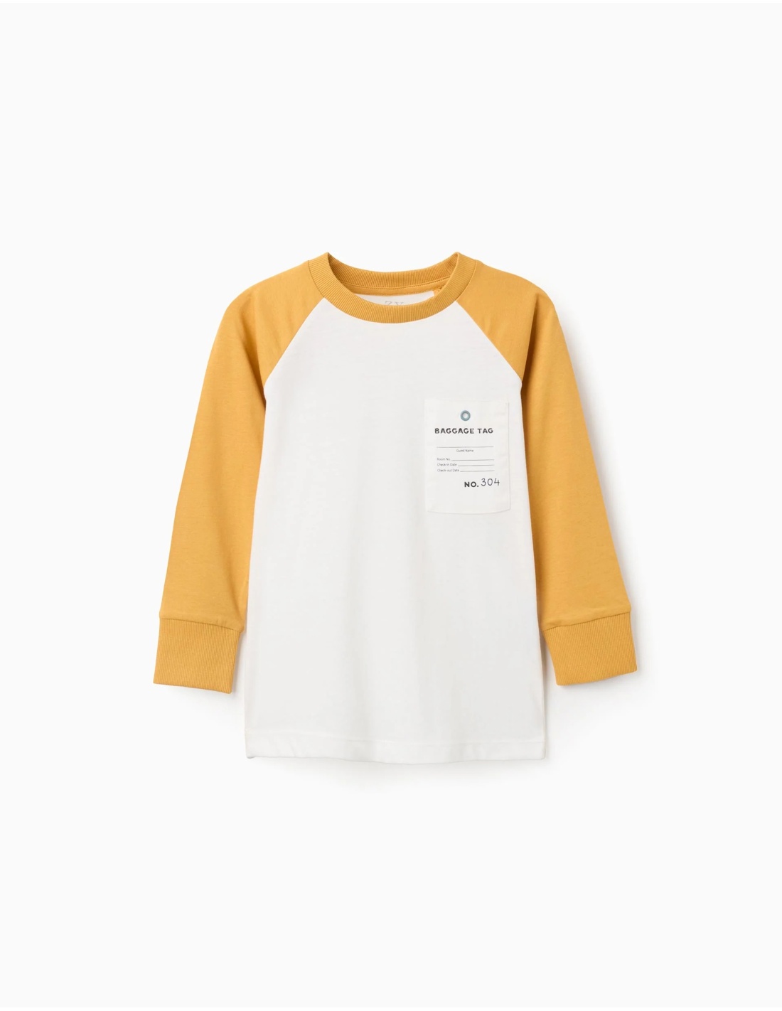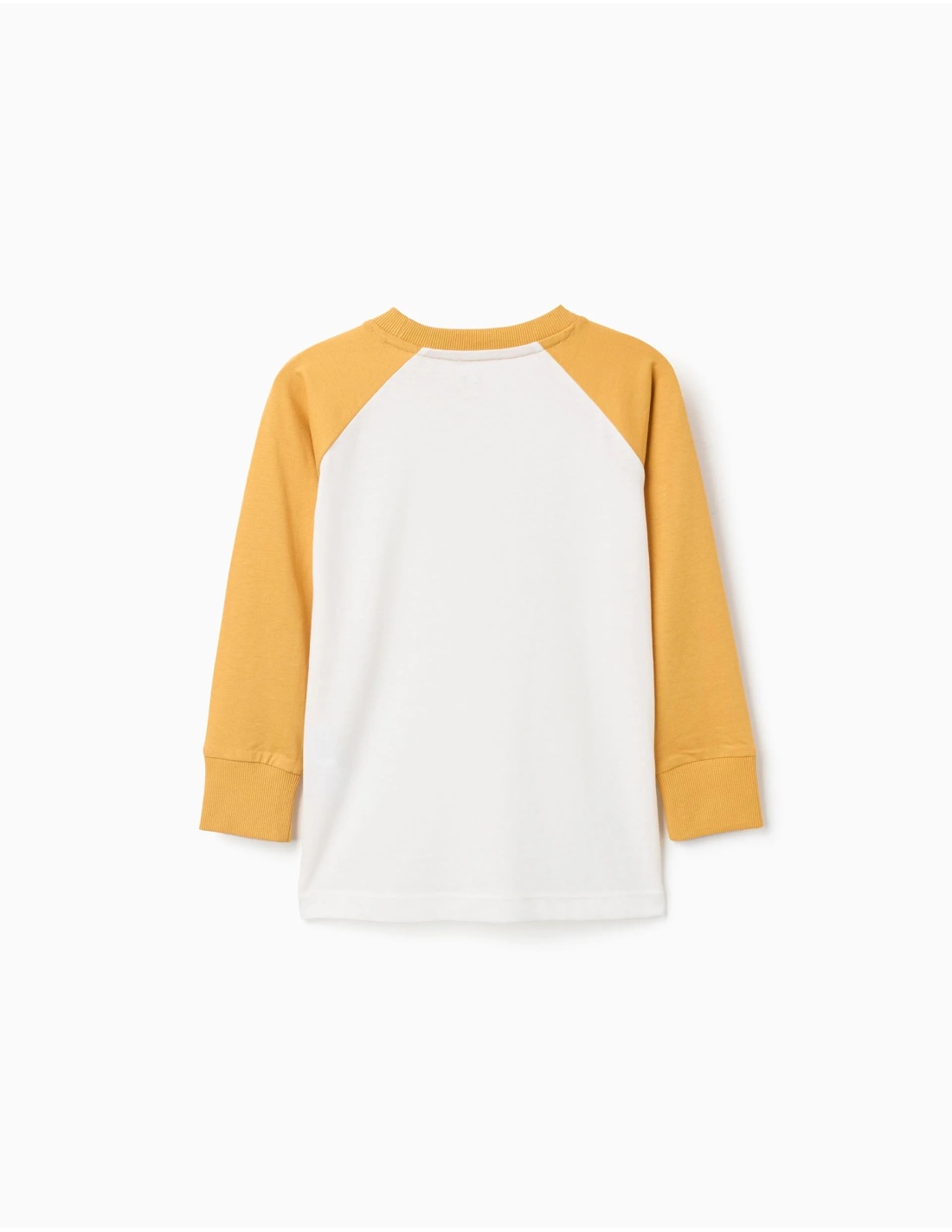 Camiseta de manga larga para niño, en una combinación de blanco y amarillo mostaza que aporta energía y estilo a sus looks diarios. Confeccionada en 100% algodón suave, es perfecta para brindar comodidad durante todo el día.