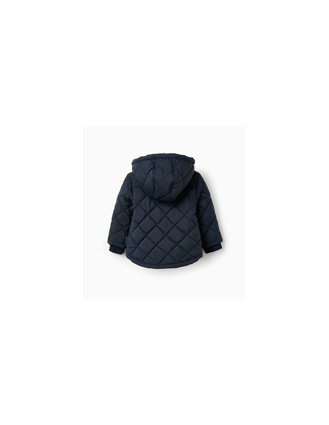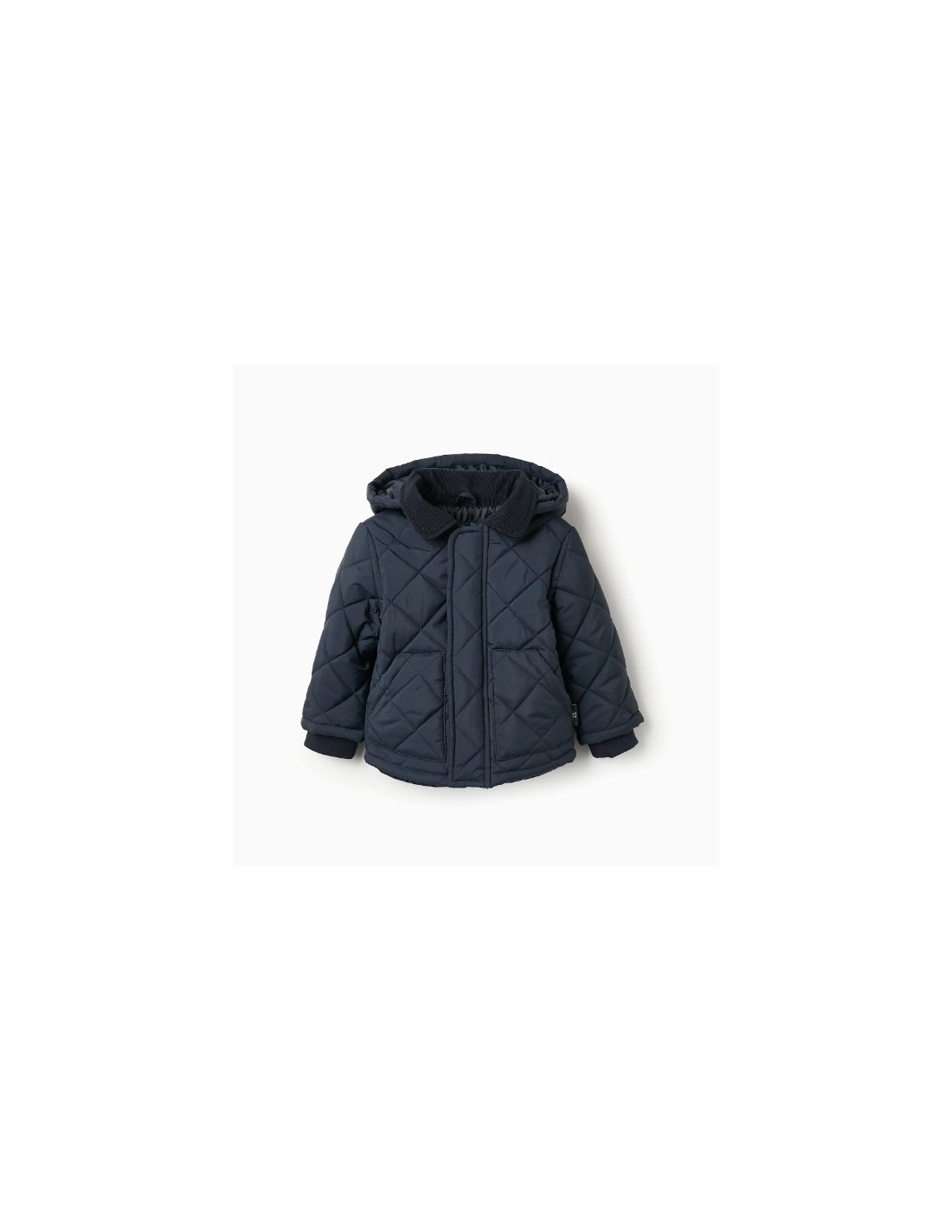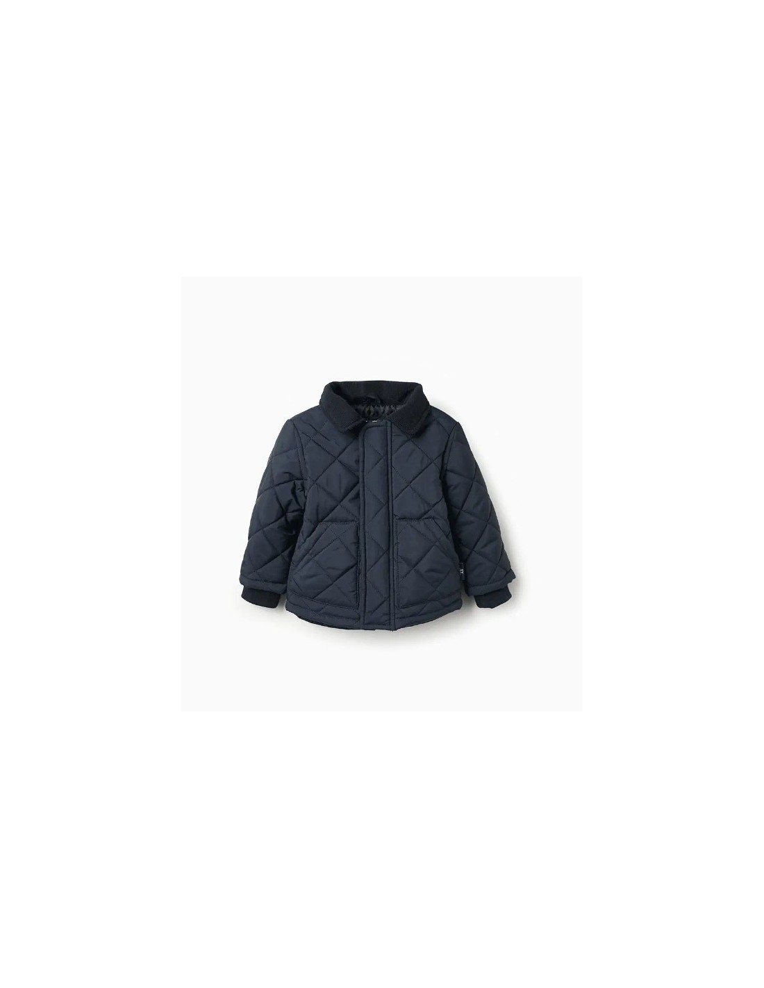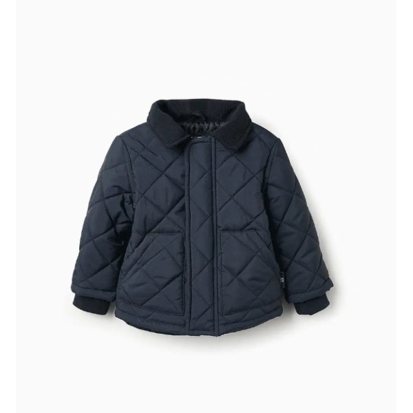Abrigo acolchado para bebé niño, con cuello de pana. Capucha desmontable para mayor flexibilidad. Bolsillos frontales. Se abrocha fácilmente con cremallera y automáticos. Puños interiores acanalados para un ajuste perfecto. Un clásico del armario, ideal para las salidas de invierno.