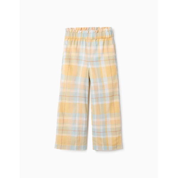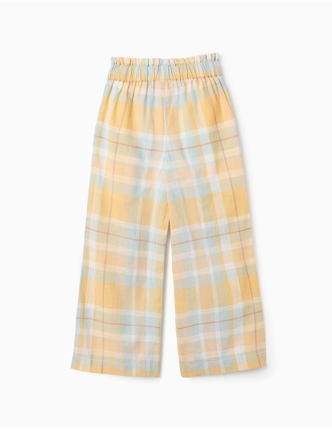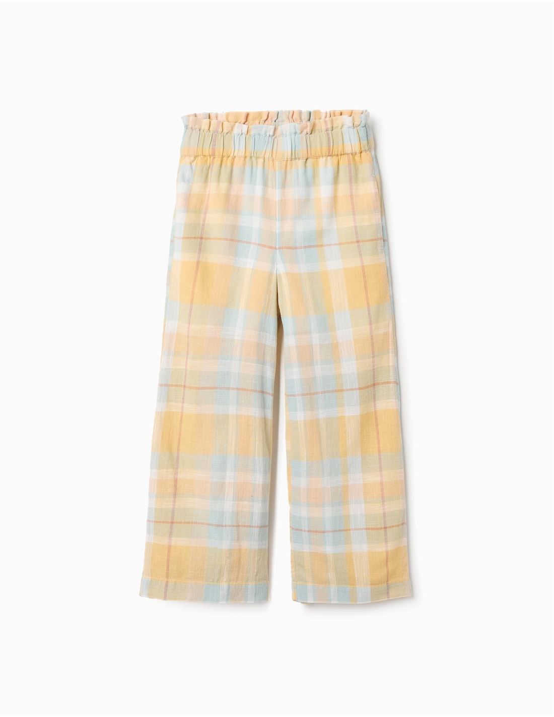 Pantalón para niña, fabricado en 100% algodón, con un diseño de cuadros en tonos amarillos y azul claro. Corte wide leg. Dispone de bolsillos laterales y cintura elástica, ajustable por dentro con elásticos y botones. Un pantalón cómodo, ligero y con un toque original, ideal para fomentar la autonomía de tu niña.
