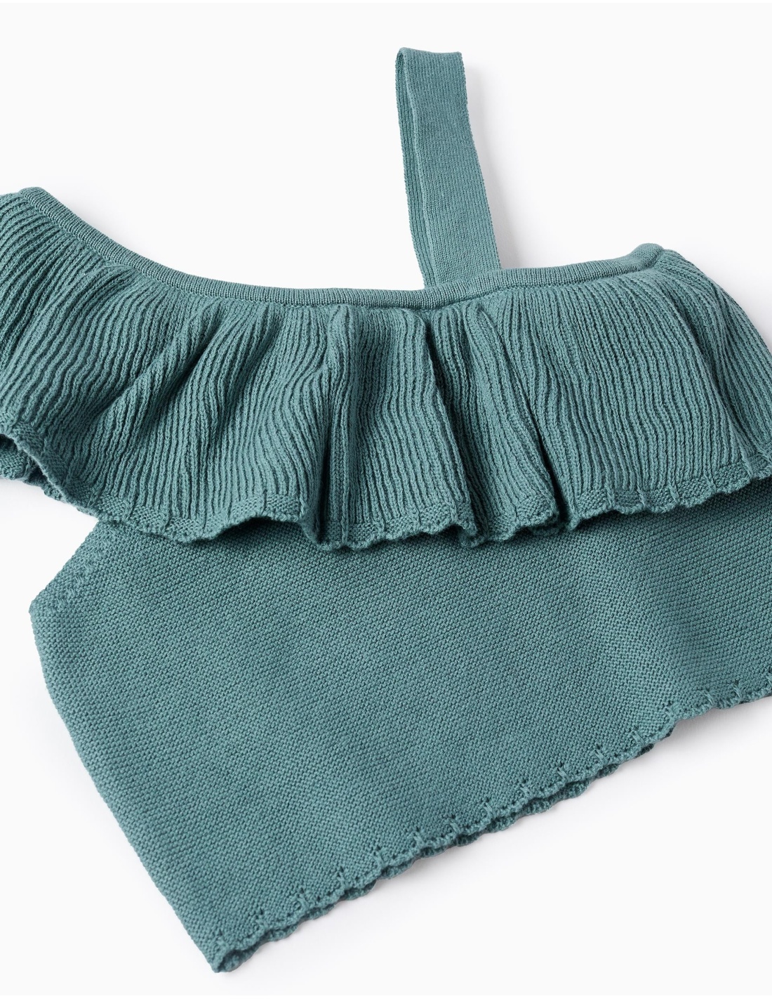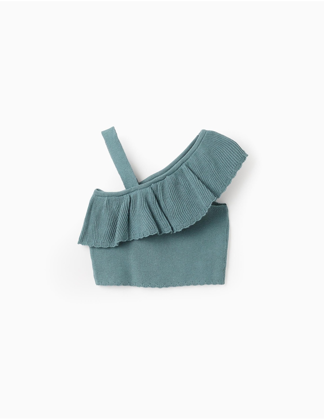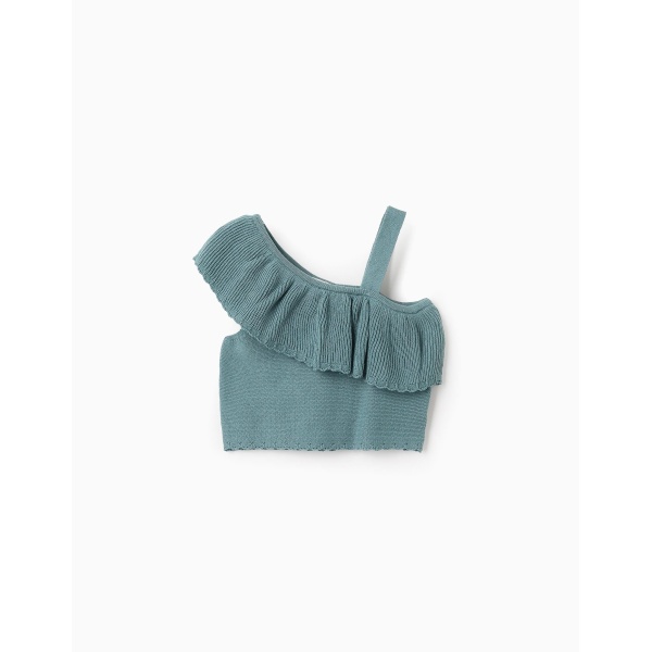 Top de punto verde para niña, 100% algodón. Diseño asimétrico, con tirante de un lado y panel de volantes alrededor. Volantes alrededor. Base ondulada. ¡Un top original y elegante!