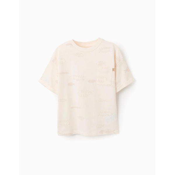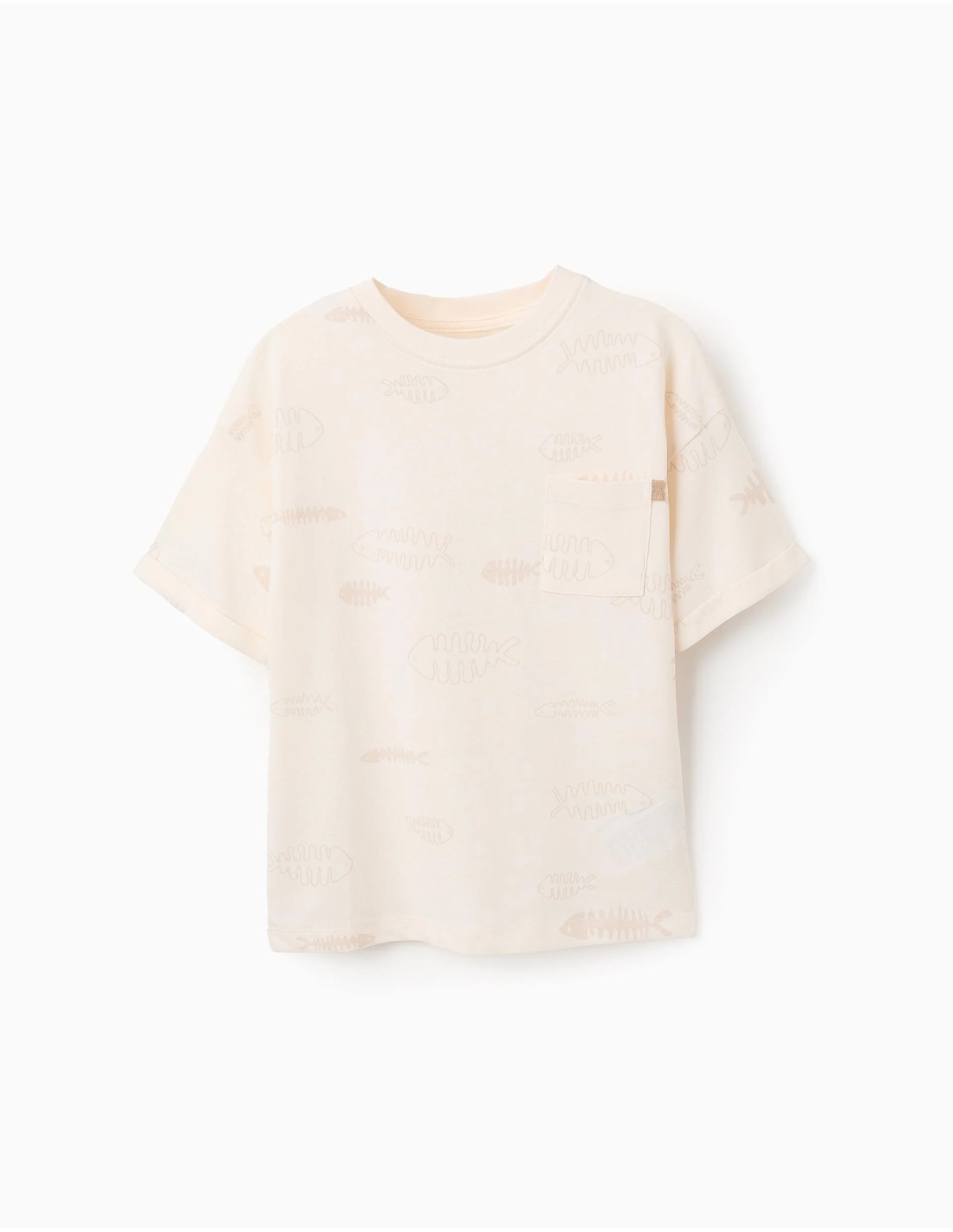 Camiseta beige para niño, 100% algodón, con estampado de espigas. Bolsillo en el pecho. Etiqueta interior estampada para no irritar la piel. Suave, cómoda y original.