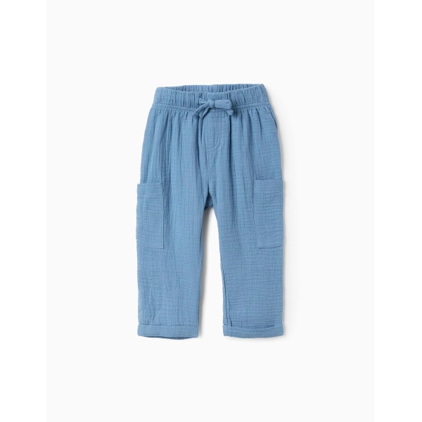 Pantalón azul para bebé niño, en bambula 100% algodón. Bolsillos cargo. Cintura elástica con cordón de ajuste. Tejido ligero y fresco, para looks relajados.