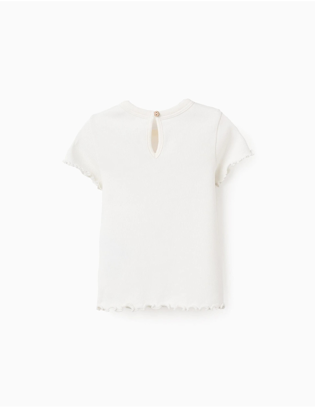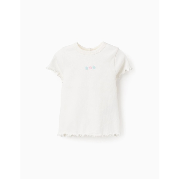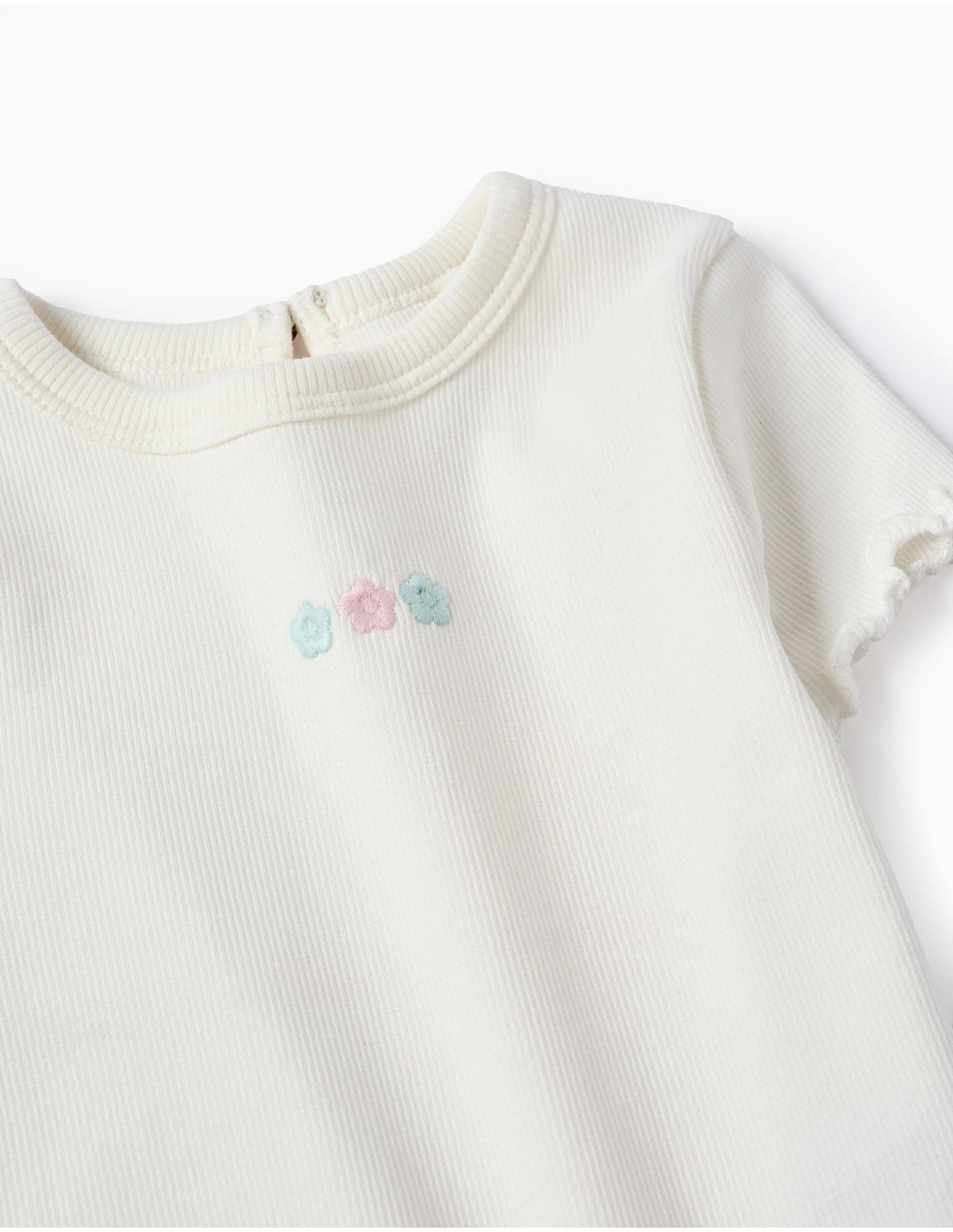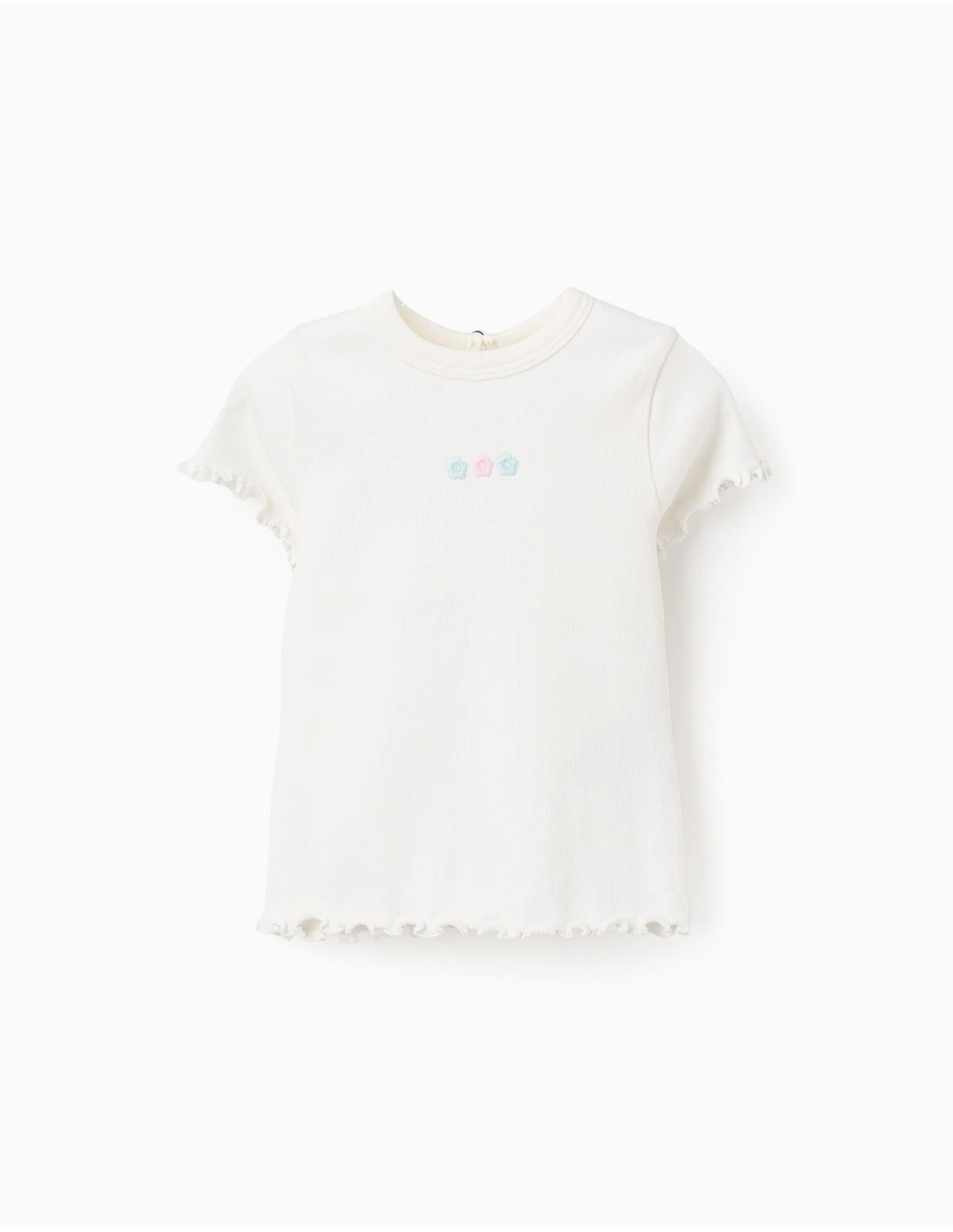 Camiseta de canalé blanca para bebé niña, de algodón con un toque de elasticidad para mayor comodidad y libertad de movimiento. Bordado de flores en rosa y azul claro. Extremos ondulados para un toque diferenciador. Botón en la espalda para vestir fácilmente. Etiqueta interior estampada para no irritar la piel. ¡Una camiseta ligera, flexible y amorosa!