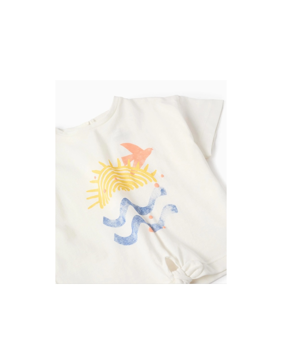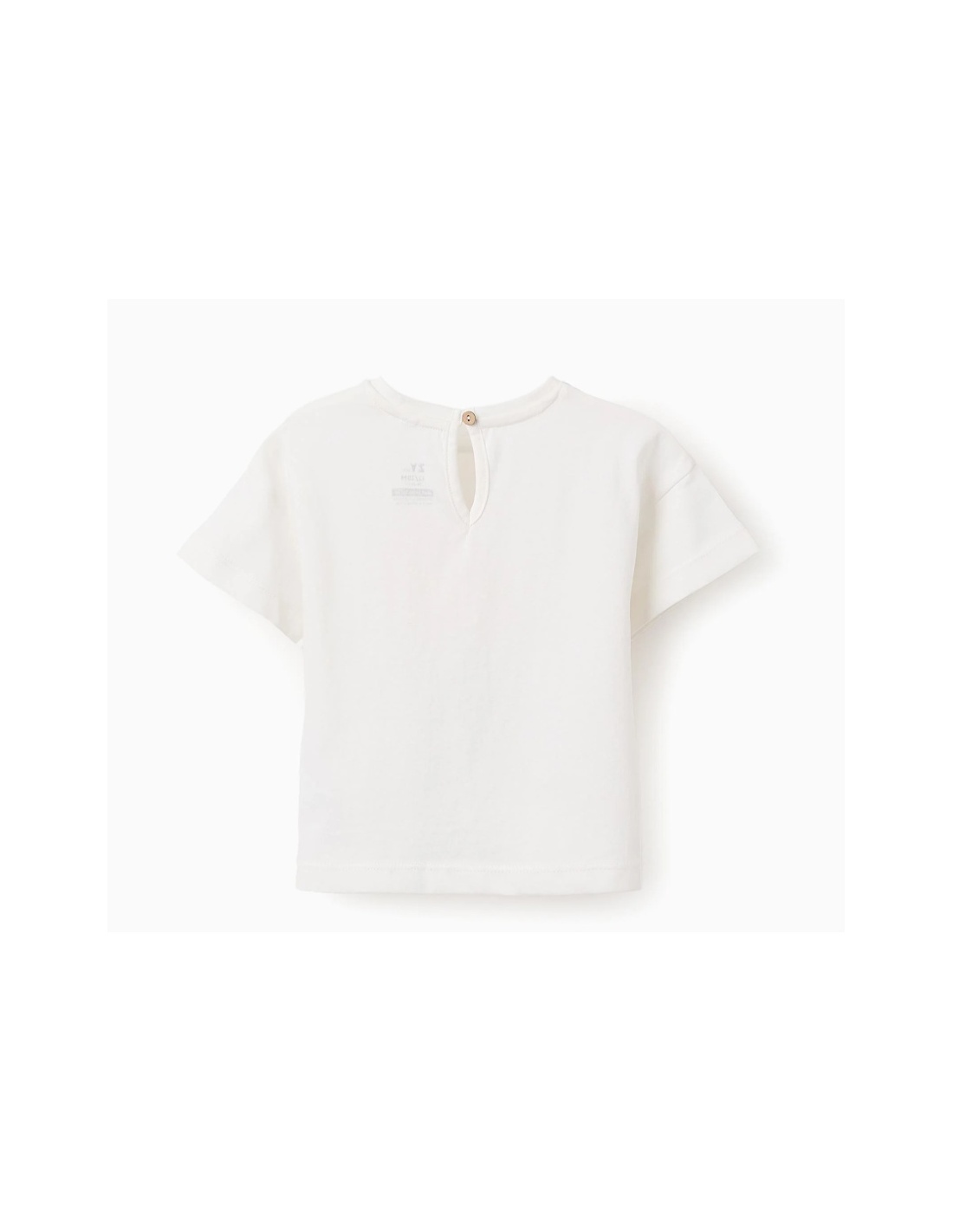 Camiseta blanca para bebé niña, 100% algodón. Mangas con hombros caídos para un ajuste relajado. Estampado frontal con detalles en relieve. Nudo decorativo en la base. Botón en la espalda para vestir fácilmente. Etiqueta interior estampada para no irritar la piel. ¡Para los looks del día a día!